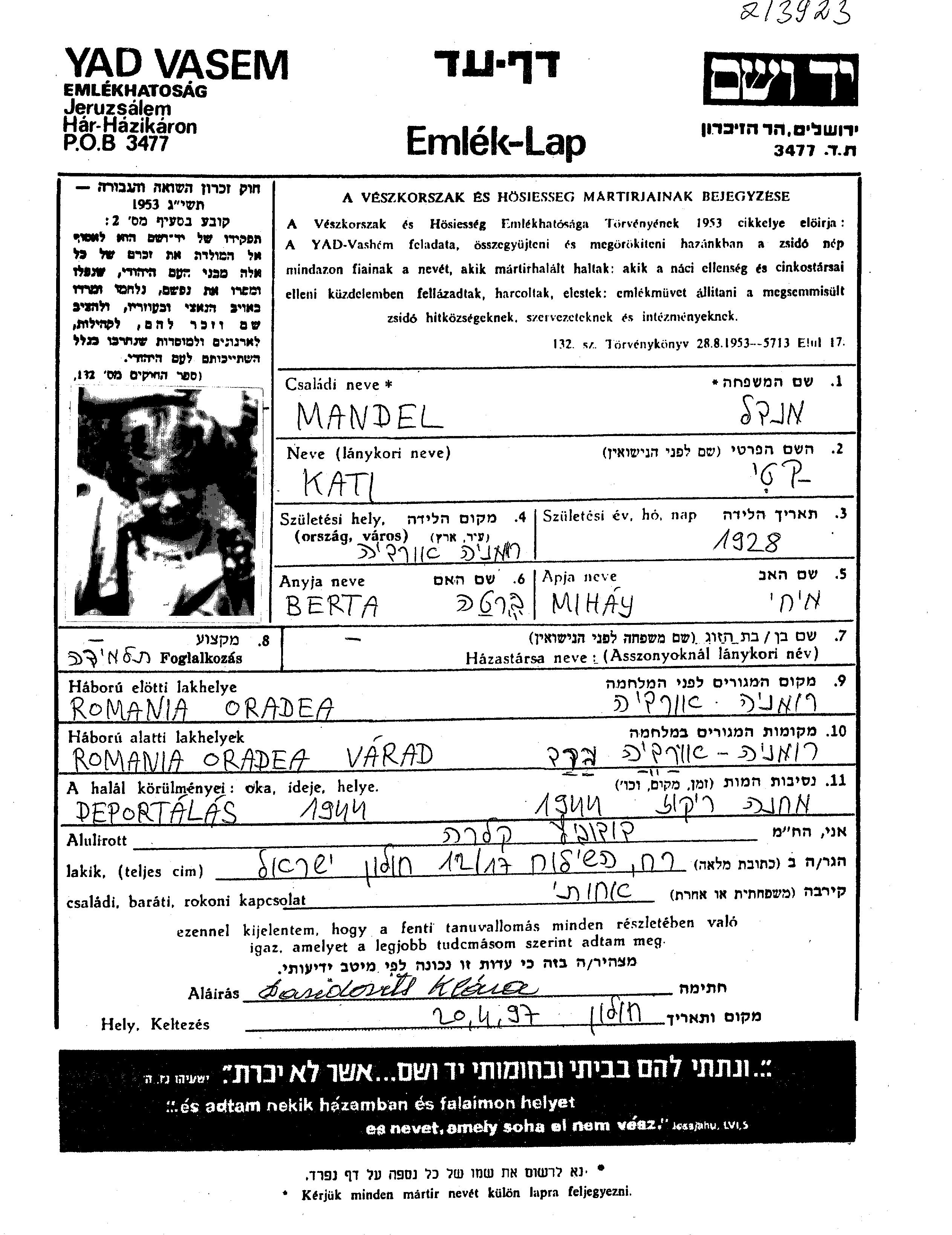 Mandel Kati 1928 Oradea, Roumanie Feuille de témoignage