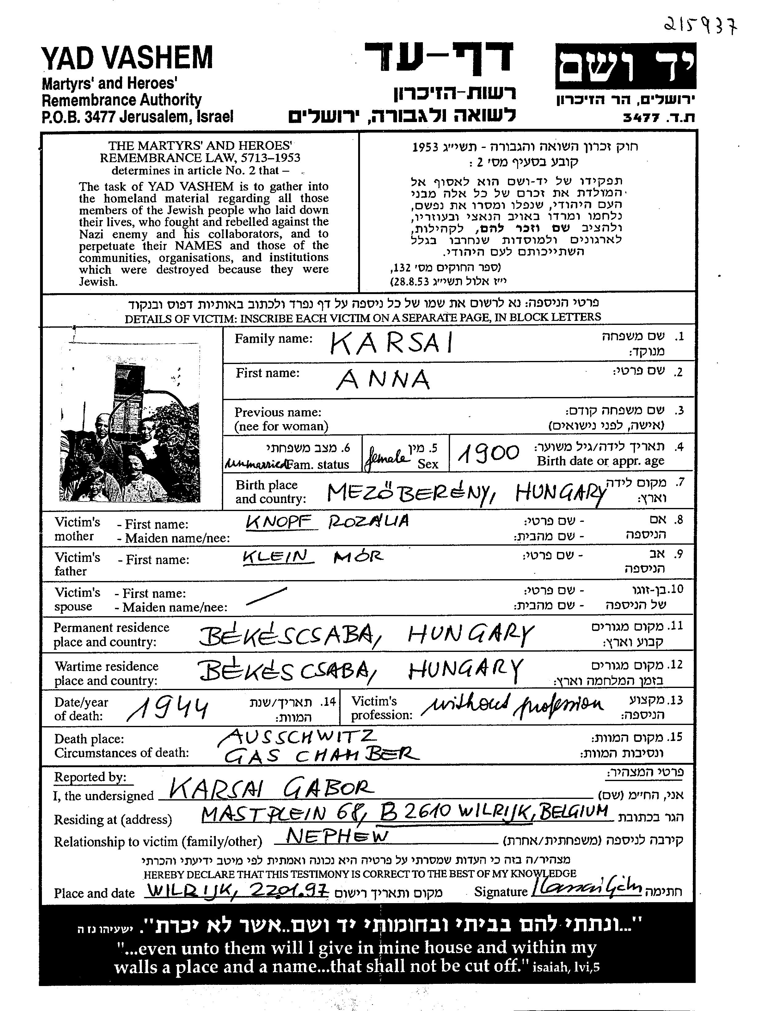 Karsai Anna 1900 Békéscsaba, Hongrie Feuille de témoignage