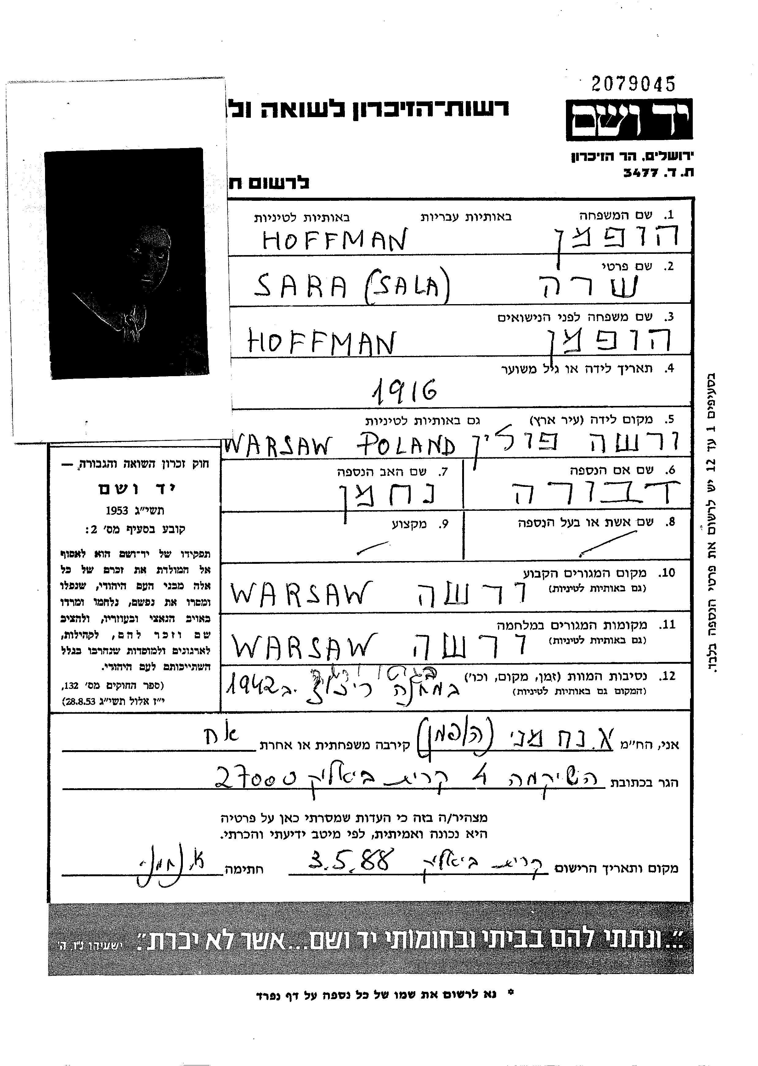 Sara Sala Hoffman est née à Warszawa, Pologne. Avant la seconde guerre mondiale elle vivait à Warszawa, Pologne.