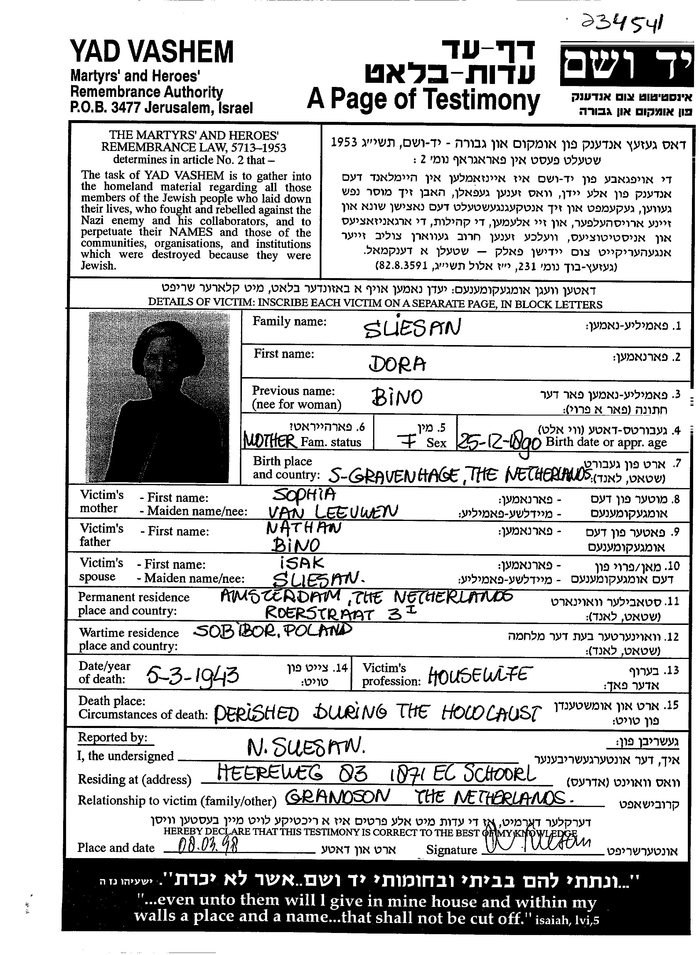 Dora Suesan née Bino est née à Pays-Bas en 1890. Elle était Femme au foyer. Avant la seconde guerre mondiale elle vivait à Amsterdam, Pays-Bas.