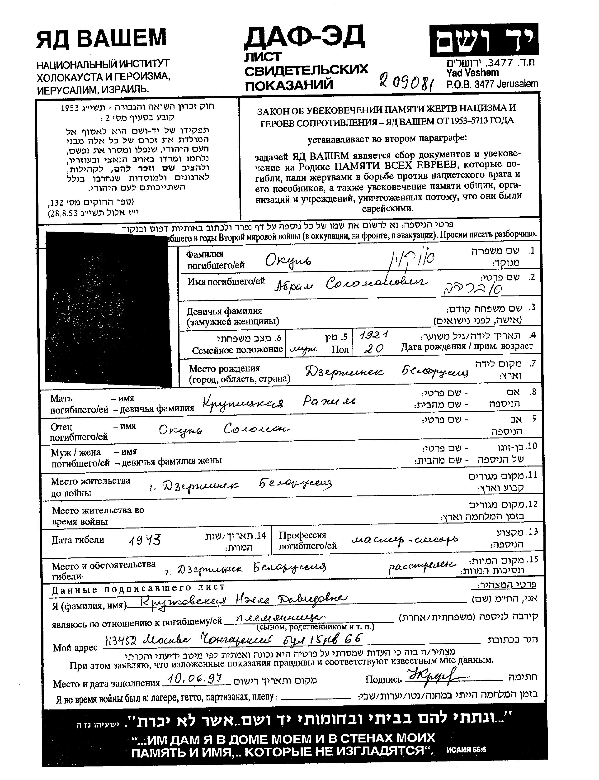 Abram Okun est né à Dzerzhinsk, Bélorussie (URSS) en 1921. Il était Ouvrier metallurgique. Avant la seconde guerre mondiale il vivait à Dzerzhinsk, Bélorussie (URSS). Abram a été assassiné pendant la Shoah. Lieu de la mort: Dzerzhinsk, Bélorussie (URSS) en 1943.