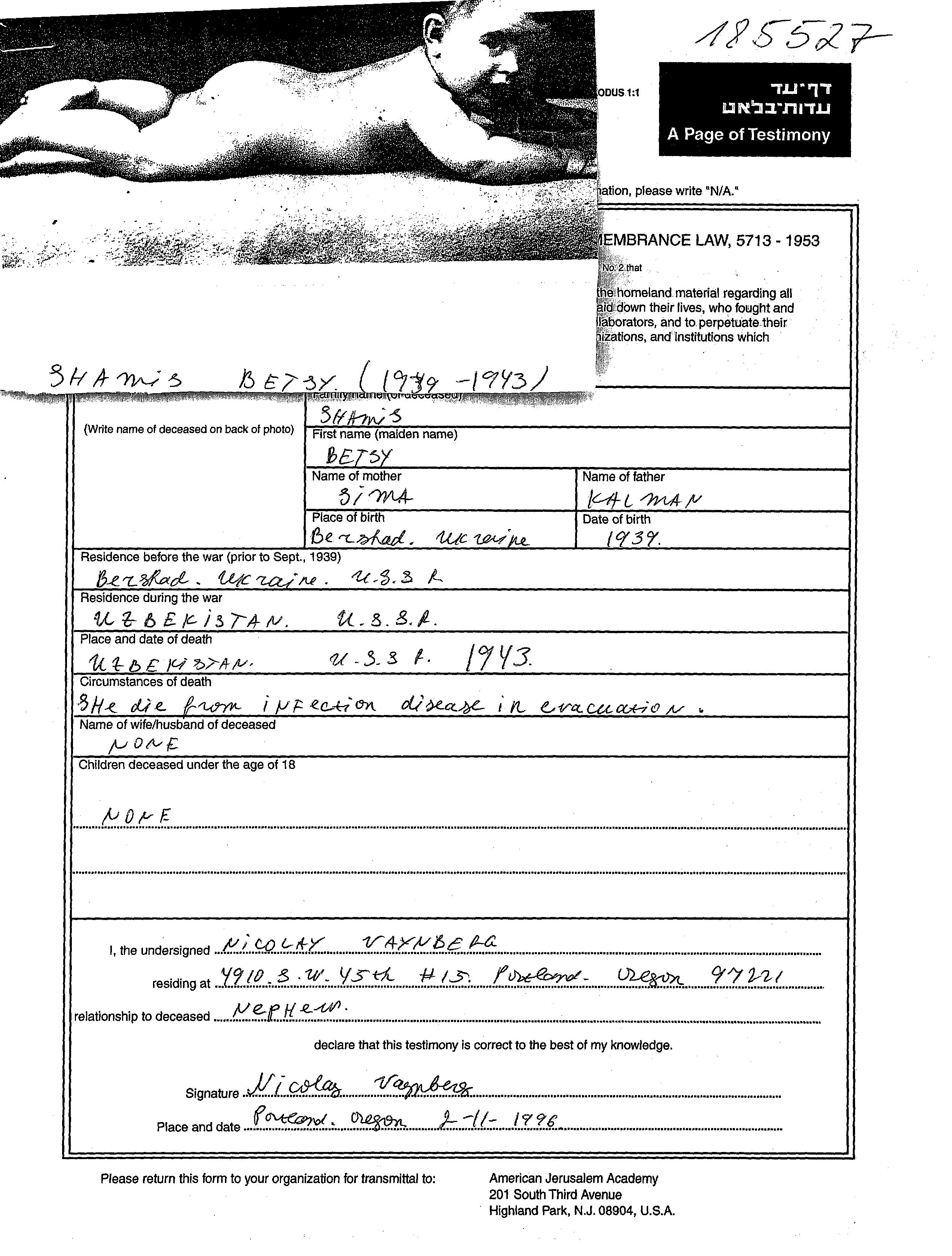 Shamis Betsy 1939 Bershad, Ukraine (URSS) Feuille de témoignage