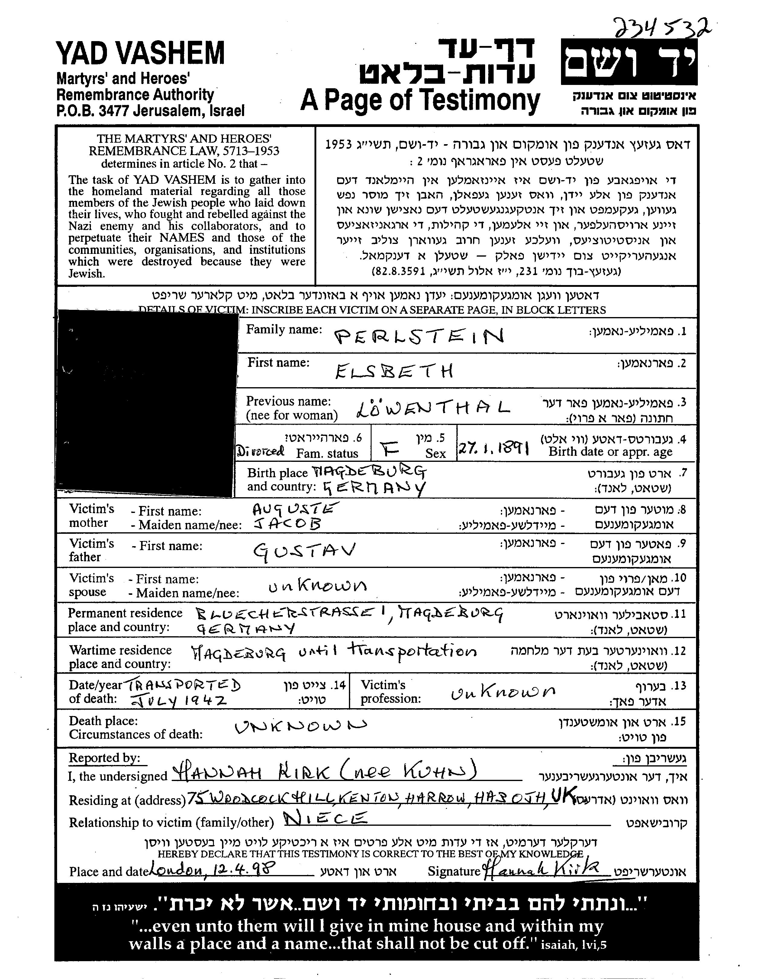 | Perlstein | Elsbeth | 1891 | Magdeburg, Allemagne | Feuille de témoignage |