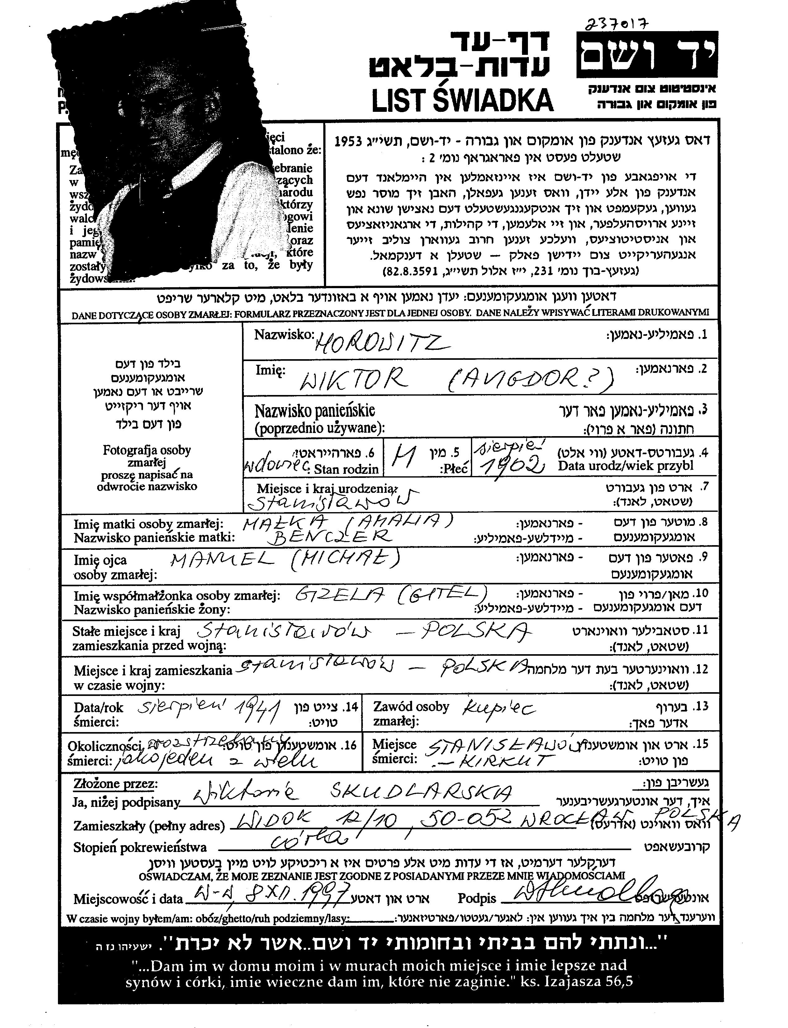 Horowitz Vigtor Viktor 1902 Stanislaw, Pologne Feuille de témoignage