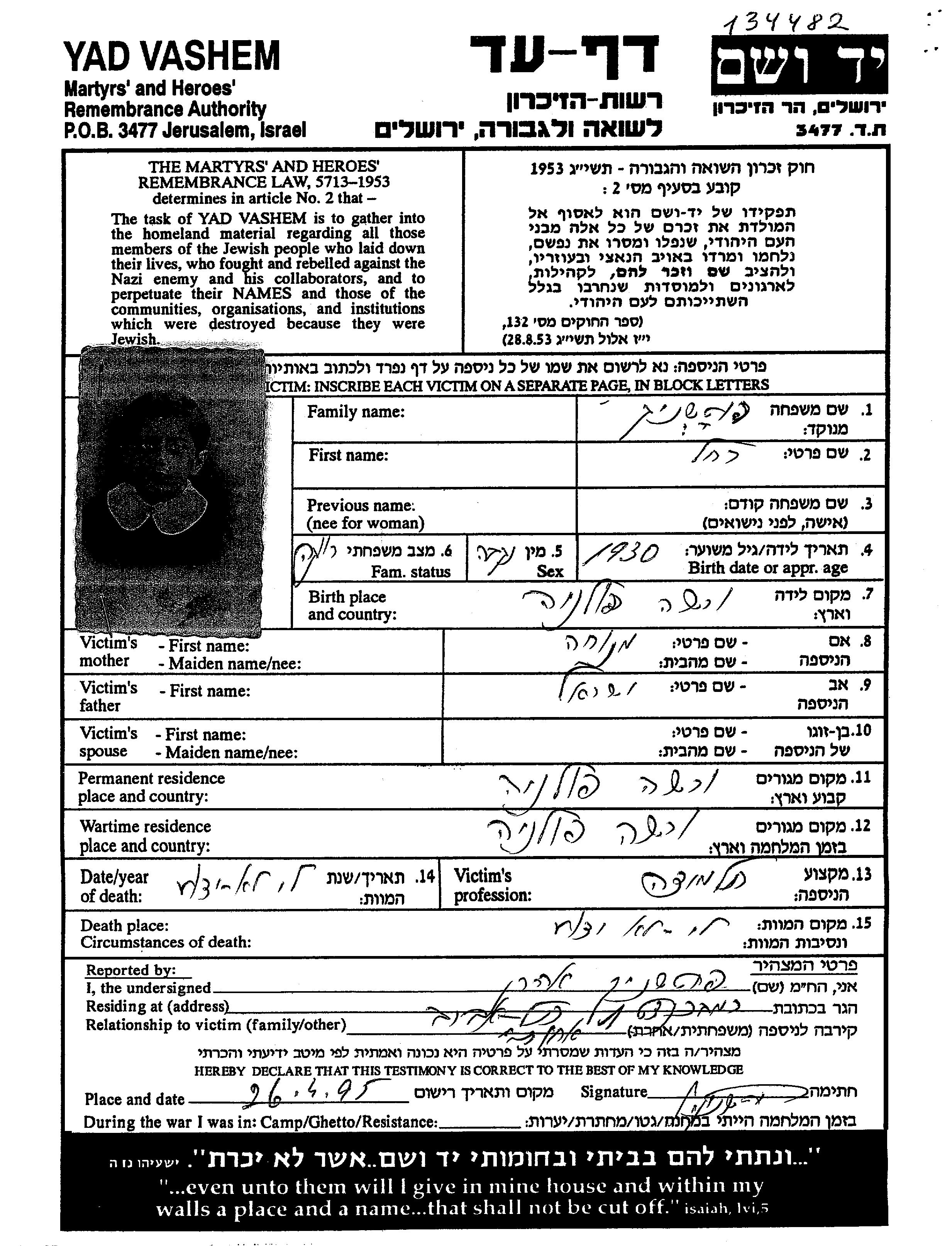 Yad Vashem - Pages of Testimony Names Memorial Collection