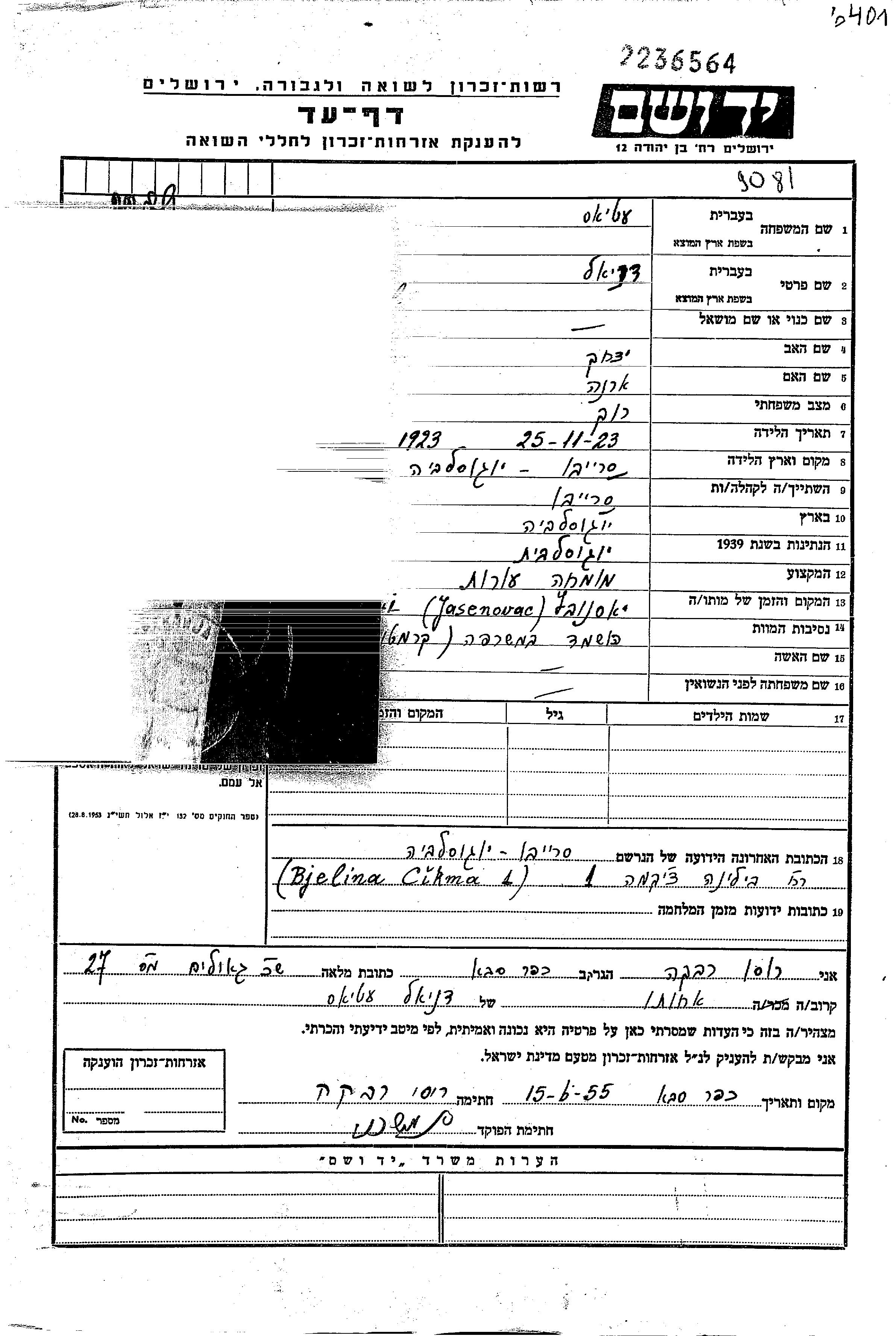Atias | Daniel | 1923 | Sarajevo, Yugoslavie | Feuille de témoignage |