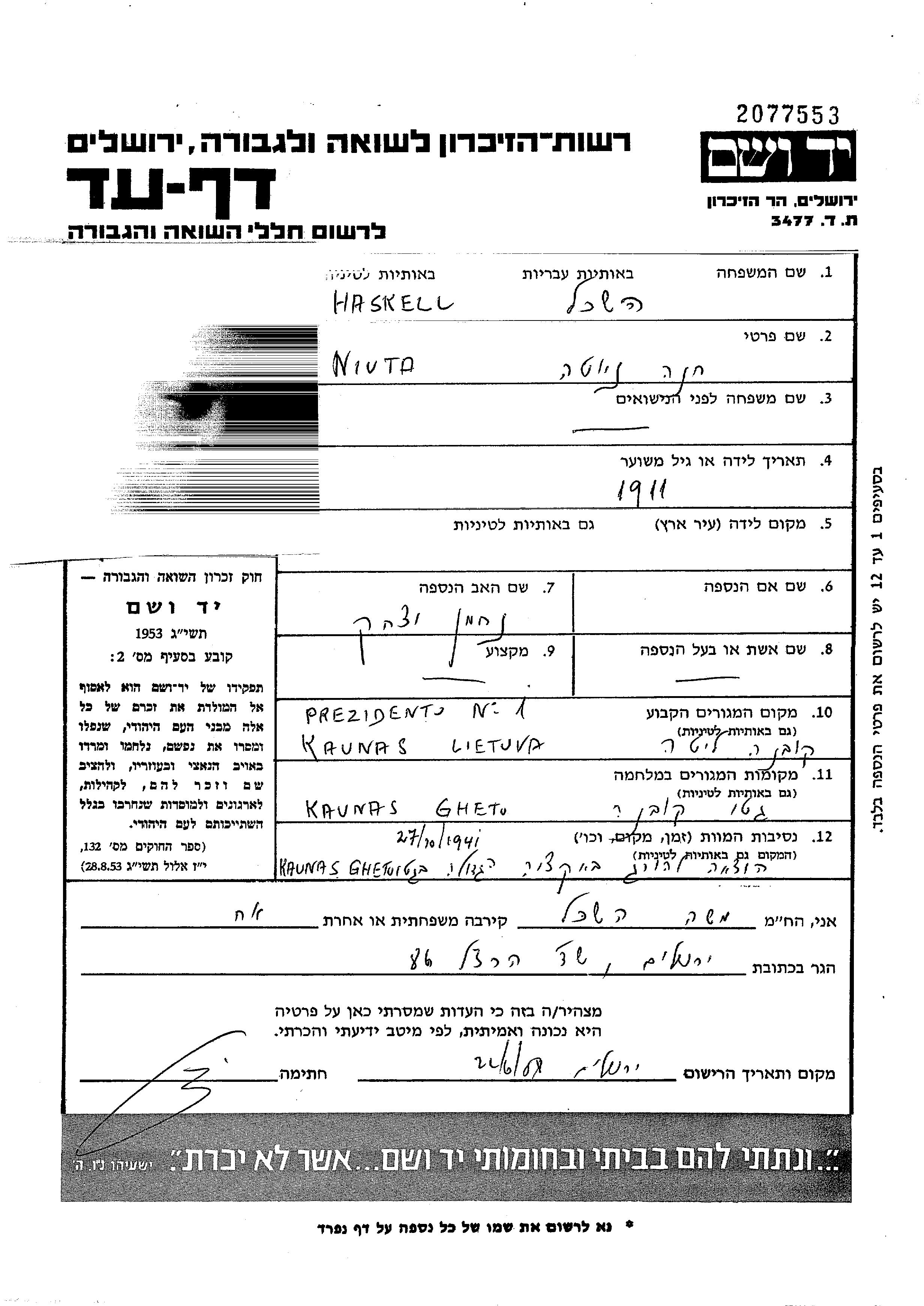 Haskell Niuta Khana 1911 Kaunas, Lituanie Feuille de témoignage