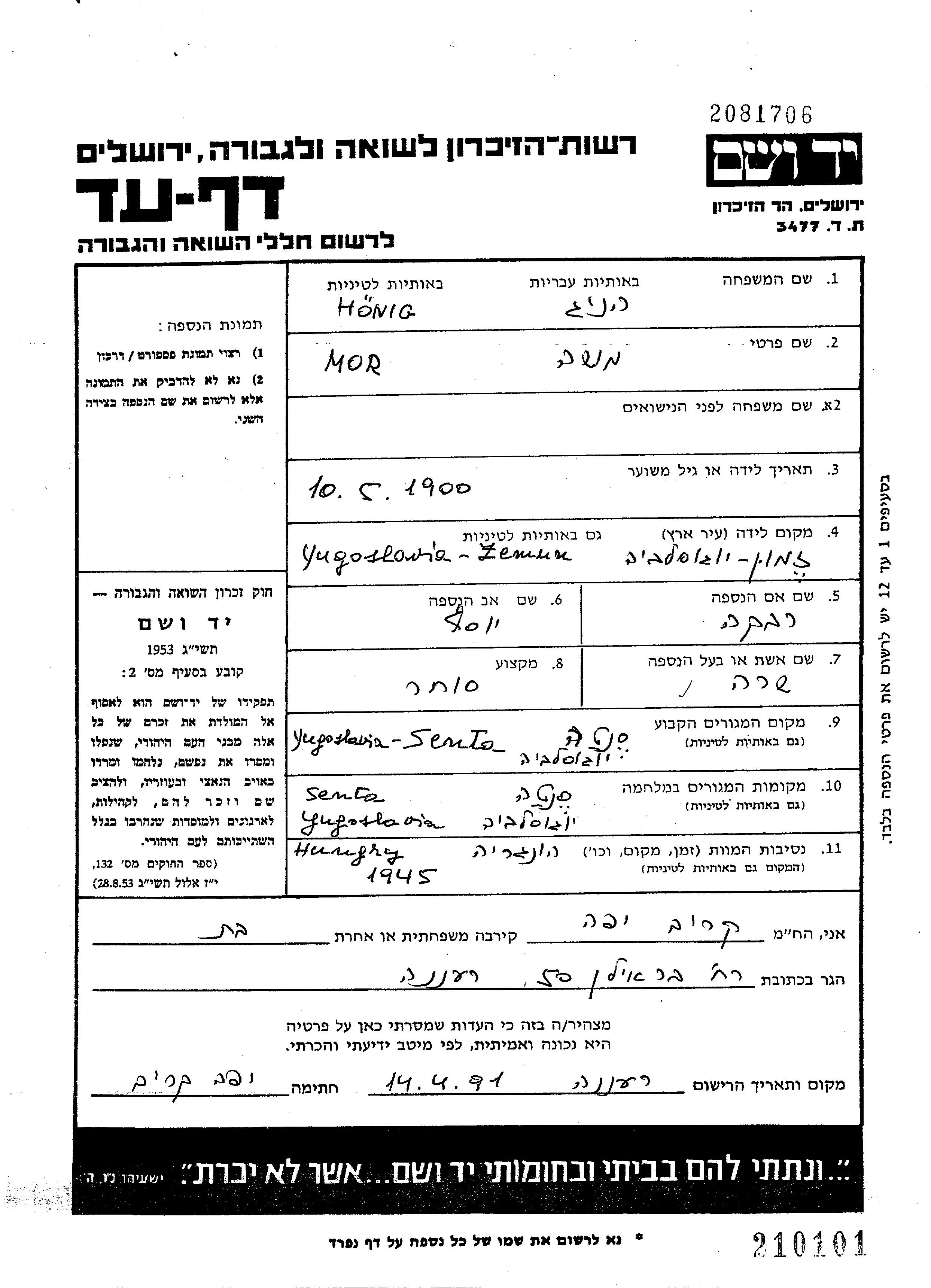 Hoenig Moshe Mor 1900 Senta, Yugoslavie Feuille de témoignage