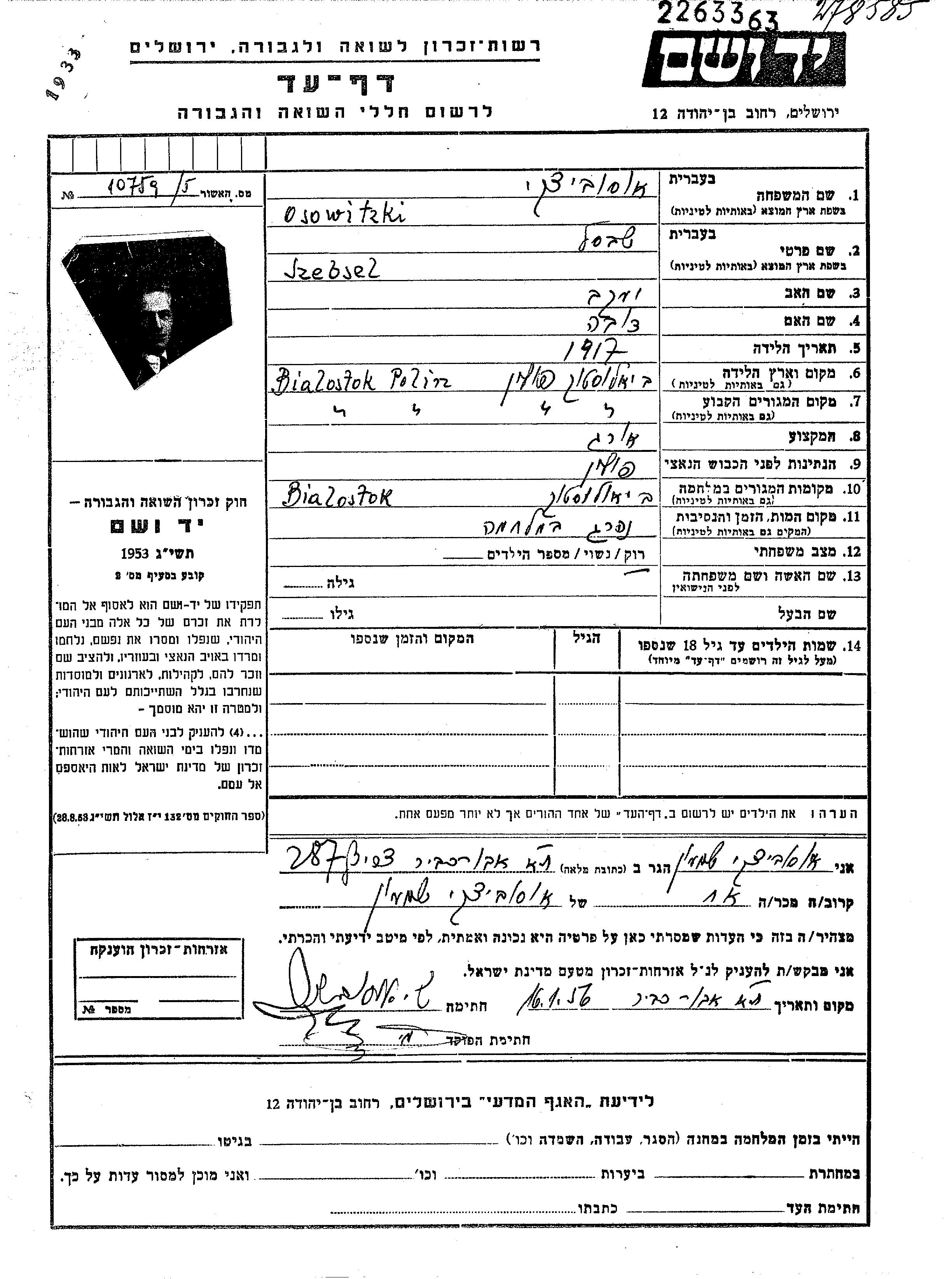 Osowitzki | Szebsel | 1917 | Bialystok, Pologne | Feuille de témoignage |