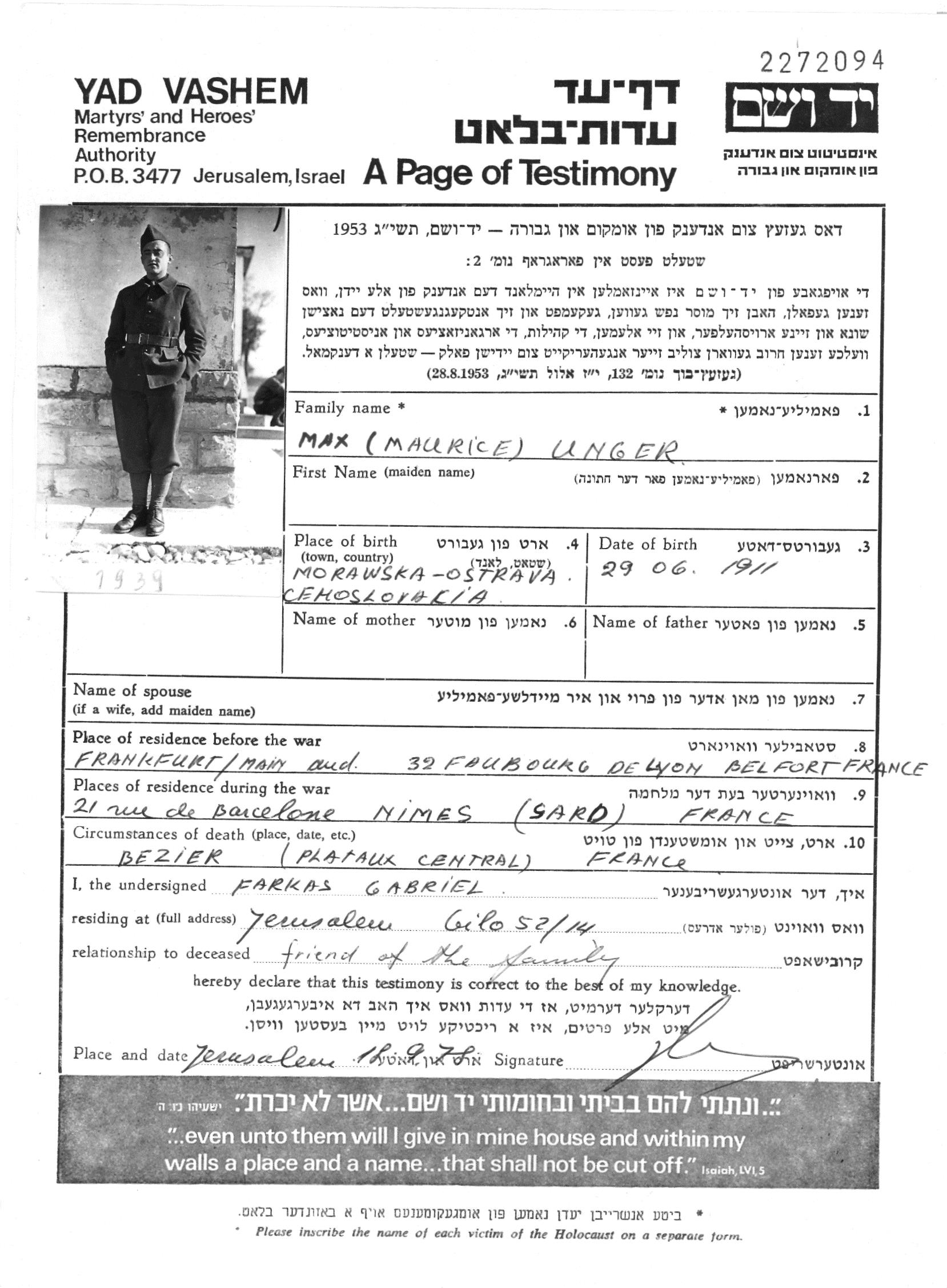 Unger Max Maurice 1911 Frankfurt Main, Allemagne Feuille de témoignage