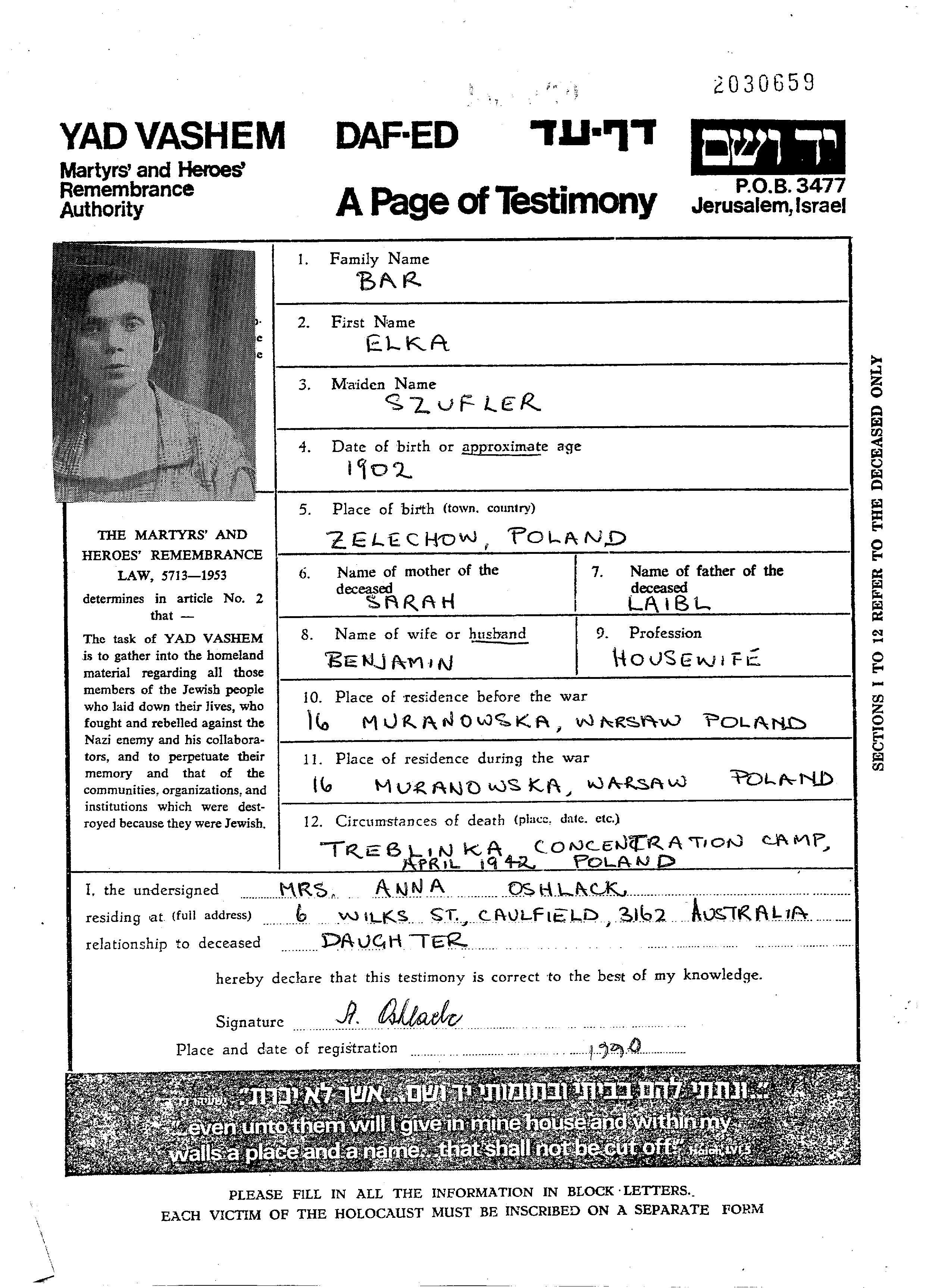Elka Bar Ber née Szufler est née à Zelechow, Pologne en 1902. Elle était Femme au foyer. Avant la seconde guerre mondiale elle vivait à Warszawa, Pologne.