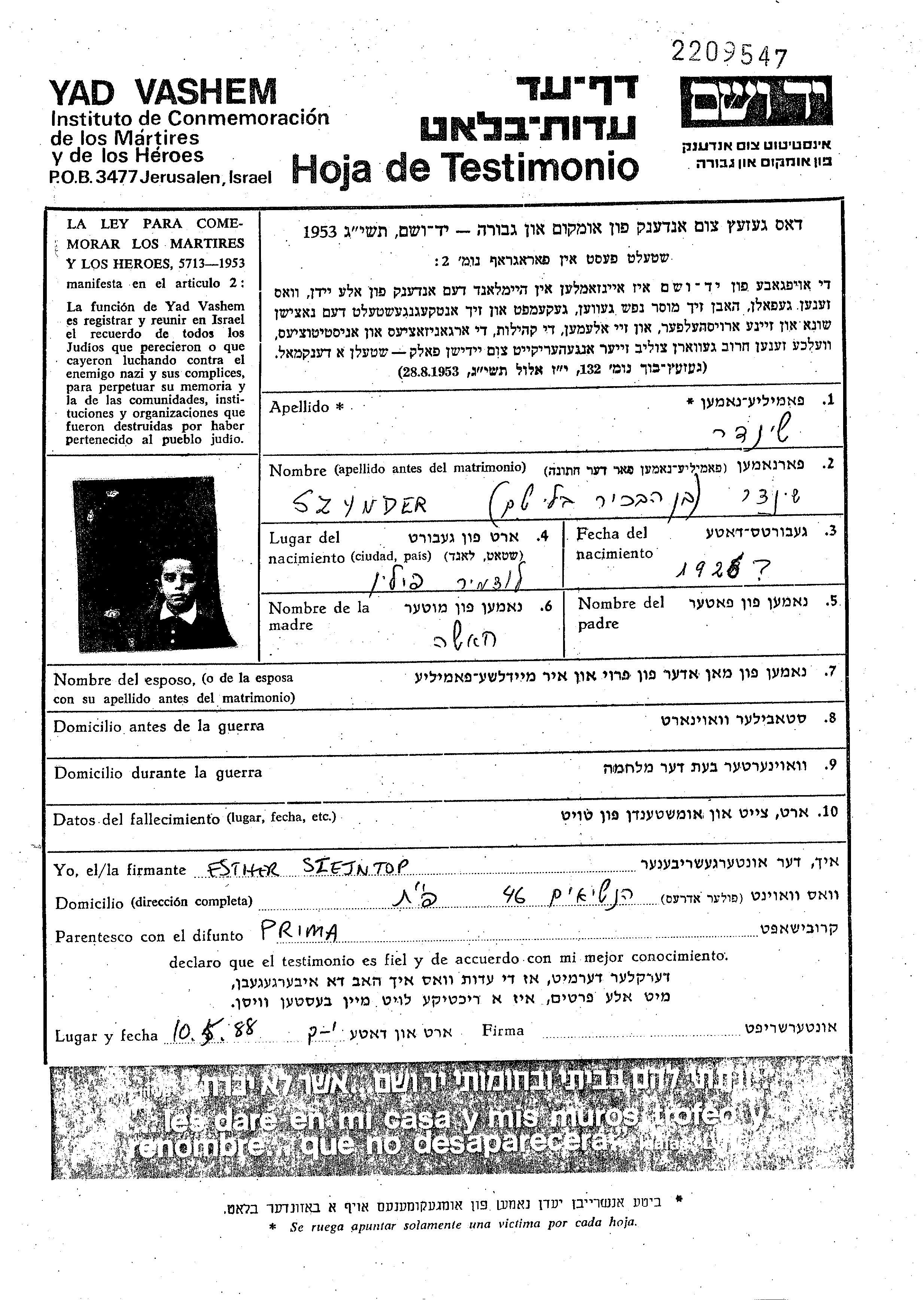 | Szynder | prénom inconnu | endroit inconnu, | Feuille de témoignage | |