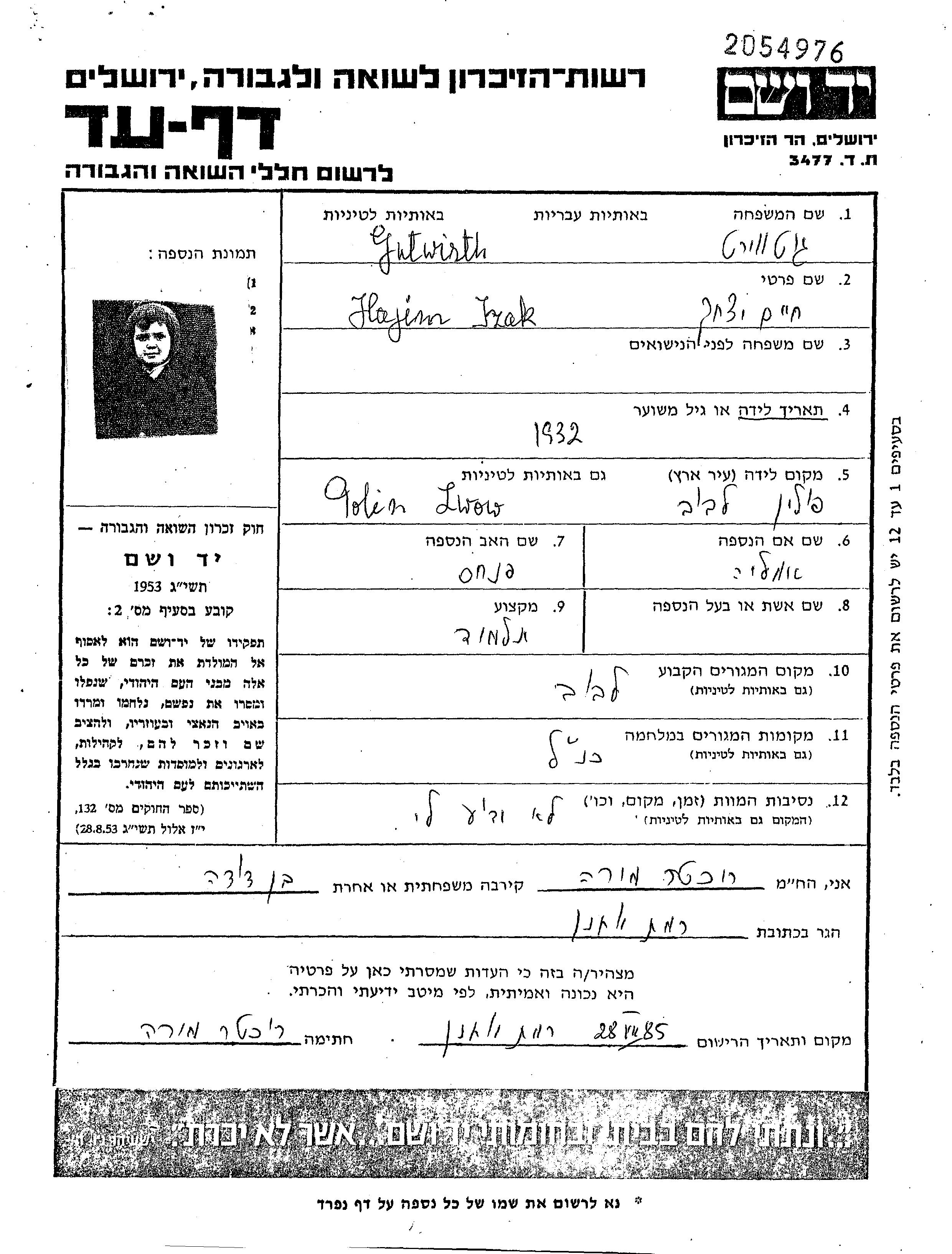 Gutwirth Hajim Izak 1932 Lwow, Pologne Feuille de témoignage