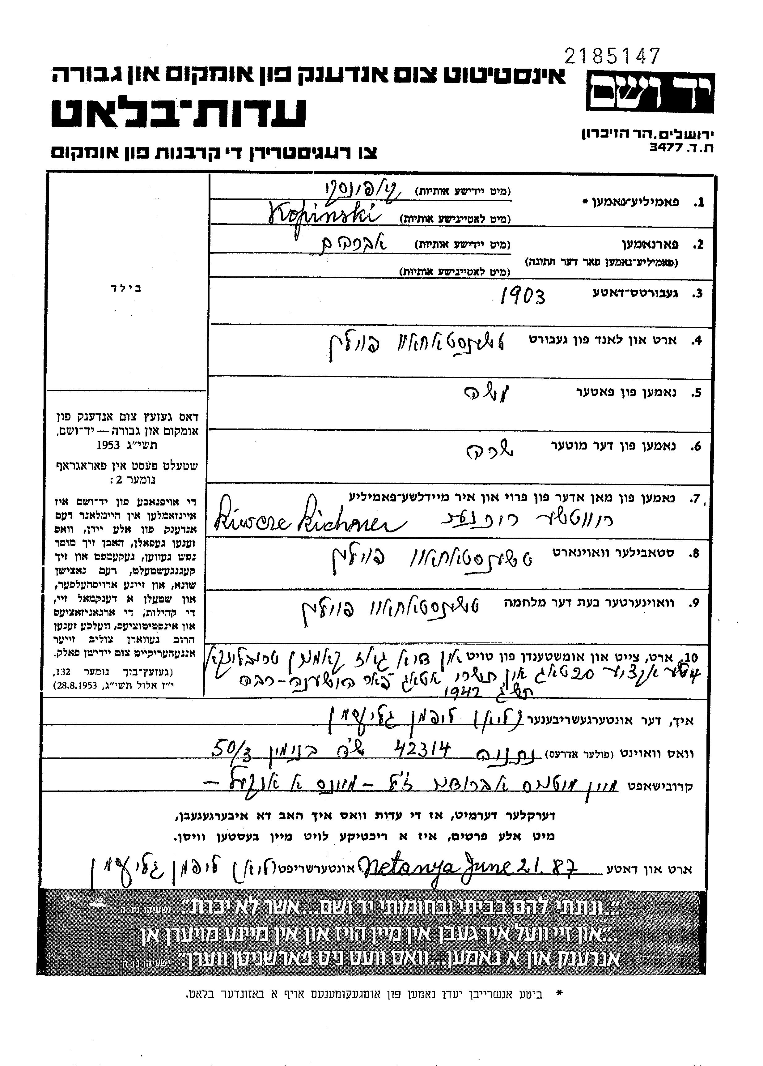 Kopinski Avraham 1903 Czestochowa, Pologne Feuille de témoignage