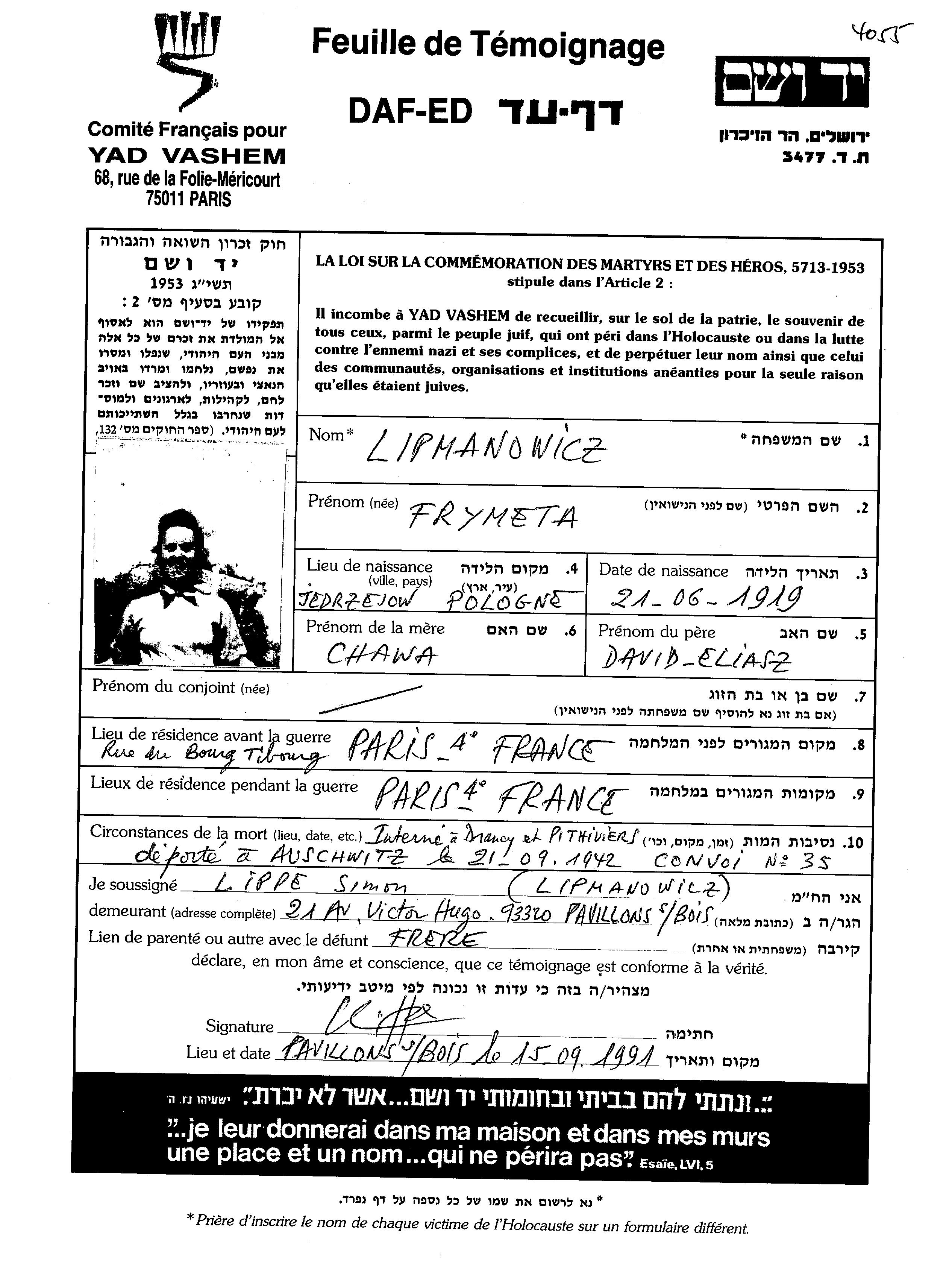 Lipmanowicz Frymeta 1919 Paris, France Feuille de témoignage