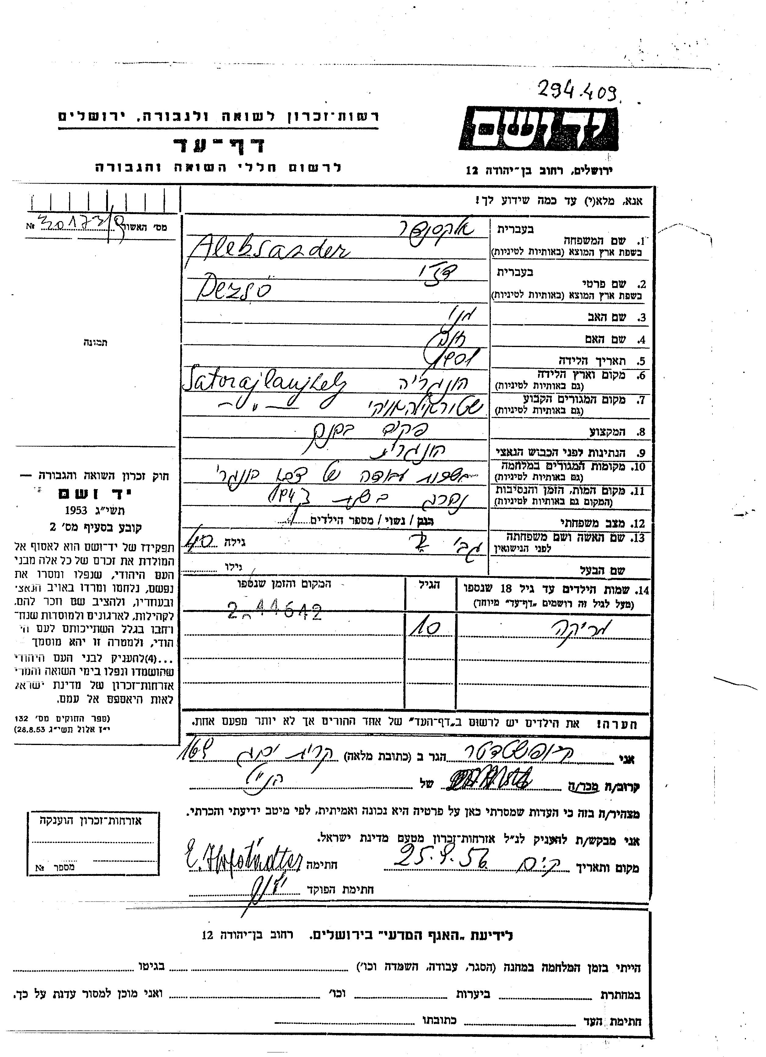 Alexander Marika 1933 Satoraljaujhely, Hongrie Feuille de témoignage