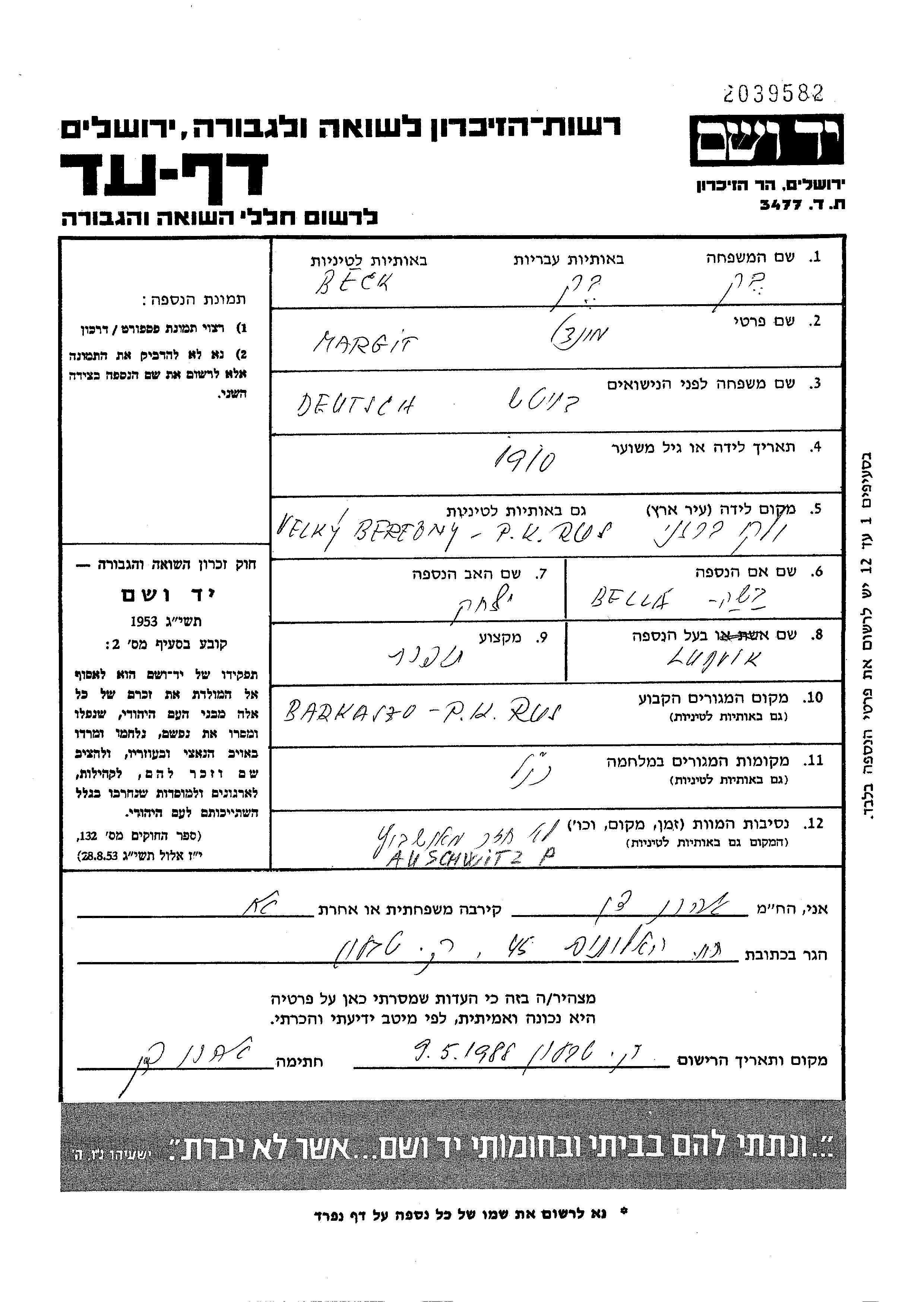 Beck | Margit Mindl | 1910 | Barkaszo, Tchécoslovaquie | Feuille de témoignage |