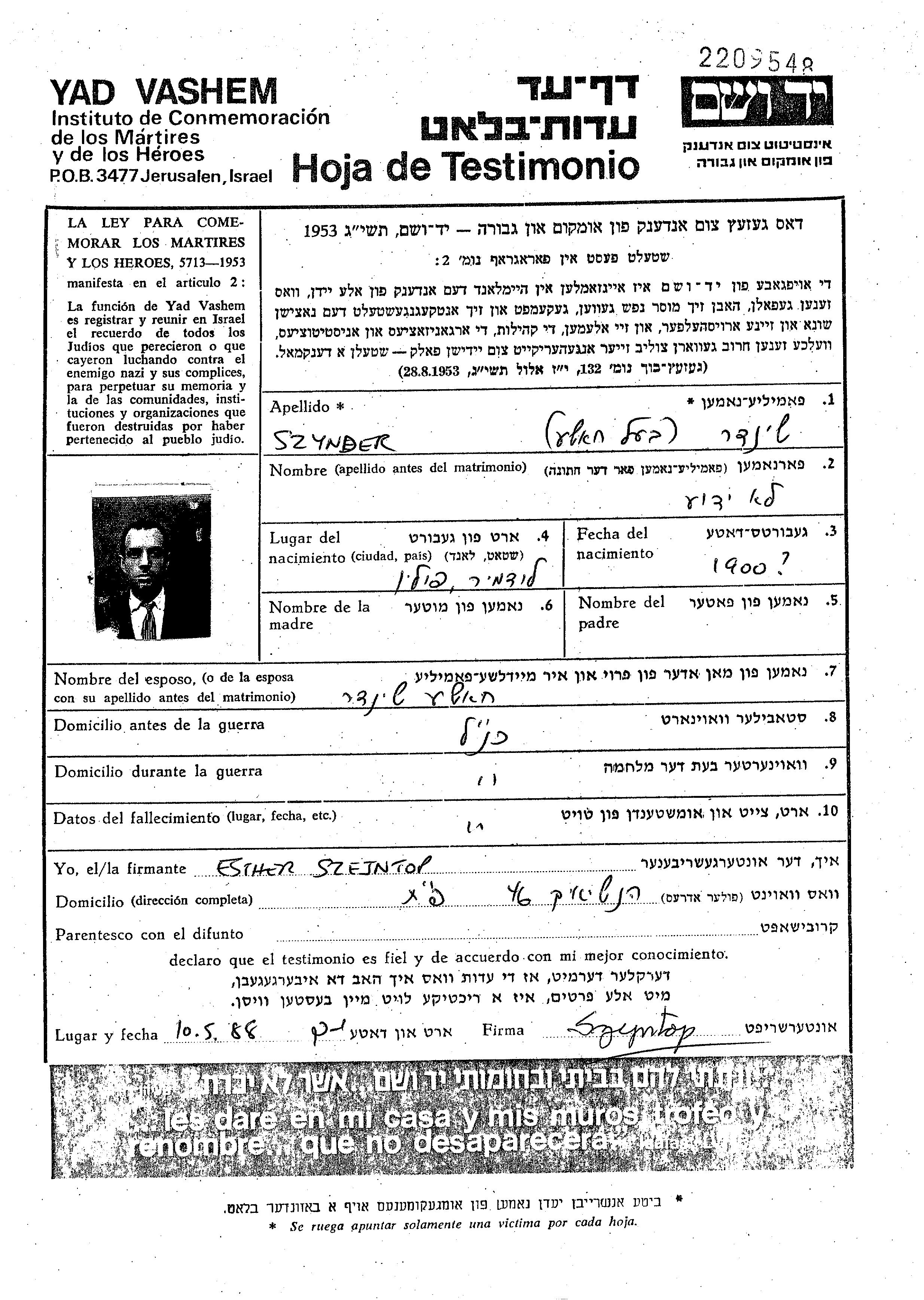 Szynder prénom inconnu Ludomir, Pologne Feuille de témoignage