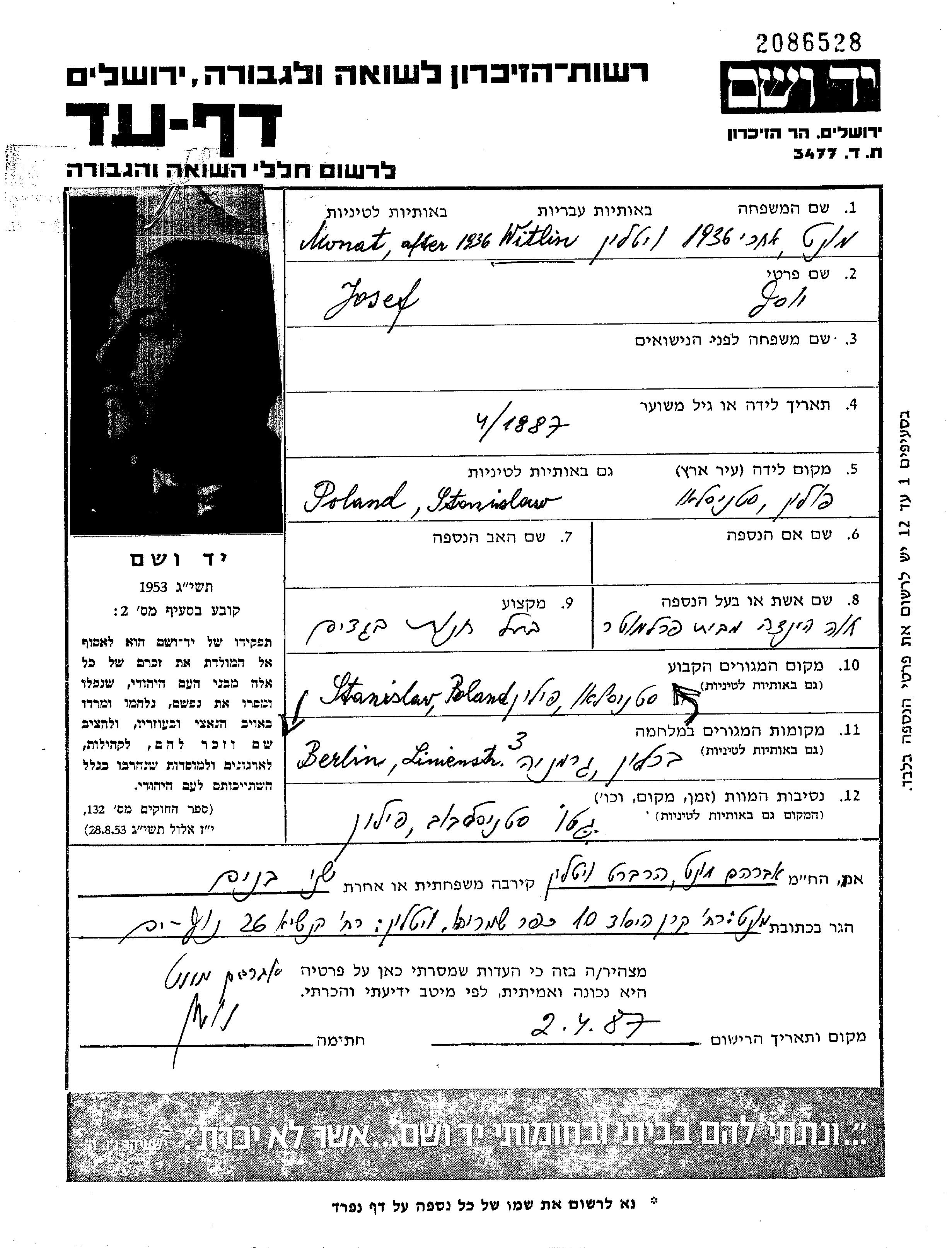 Witlin Monat | Josef | 1887 | Berlin, Allemagne | Feuille de témoignage |