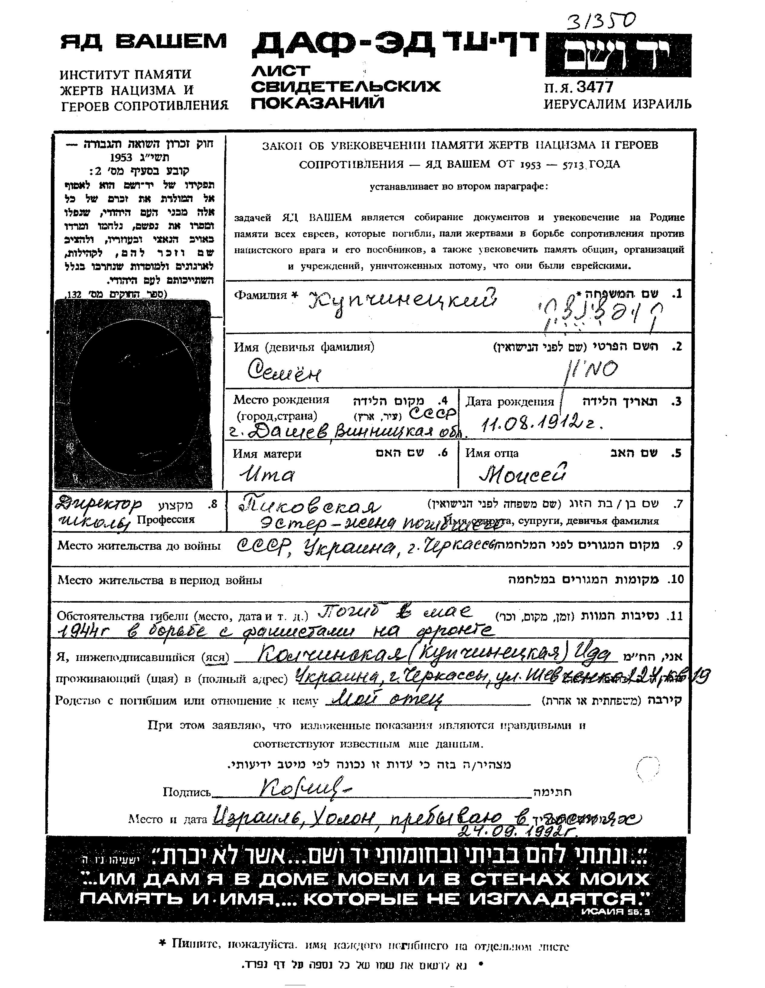 | Kupchinetzki | Semion | 1912 | Cherkassy, Ukraine (URSS) | Feuille de témoignage |