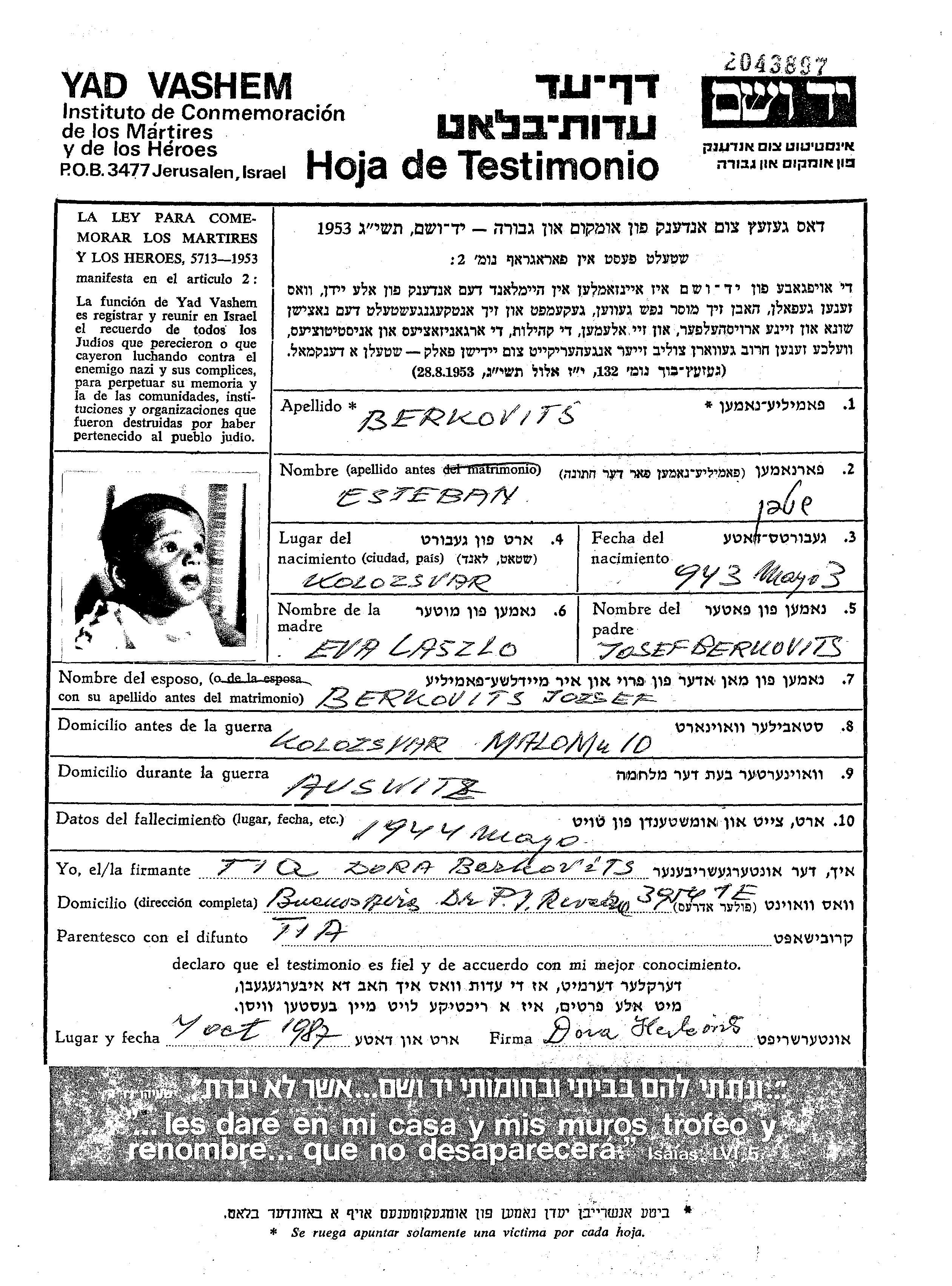 | Berkovits | Stefan Ishtvan Esteban | 1943 | Kolozsvar, Roumanie | Feuille de témoignage |