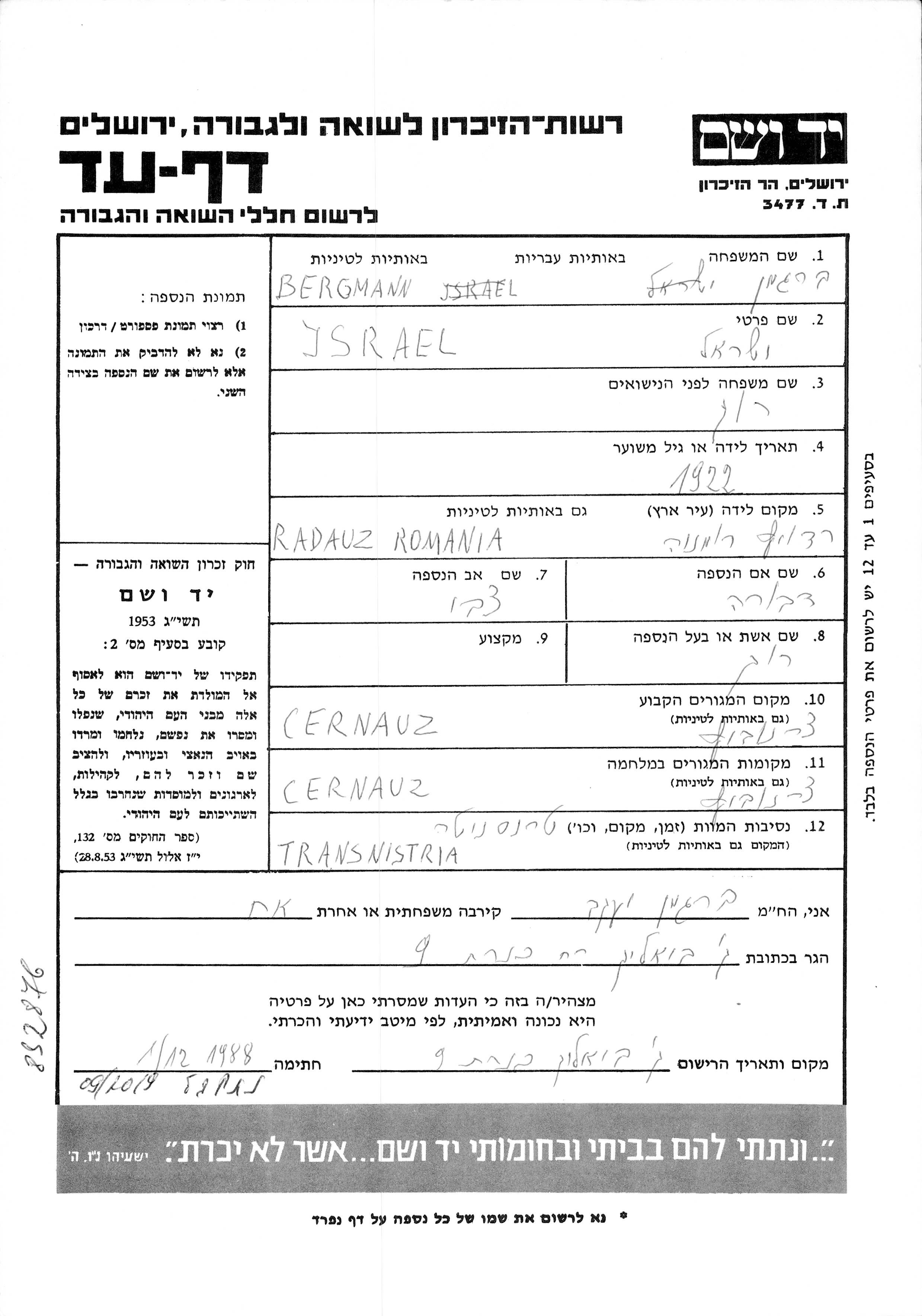 Bergman Israel Beniamin 1922 Czernowitz, Roumanie Feuille de témoignage
