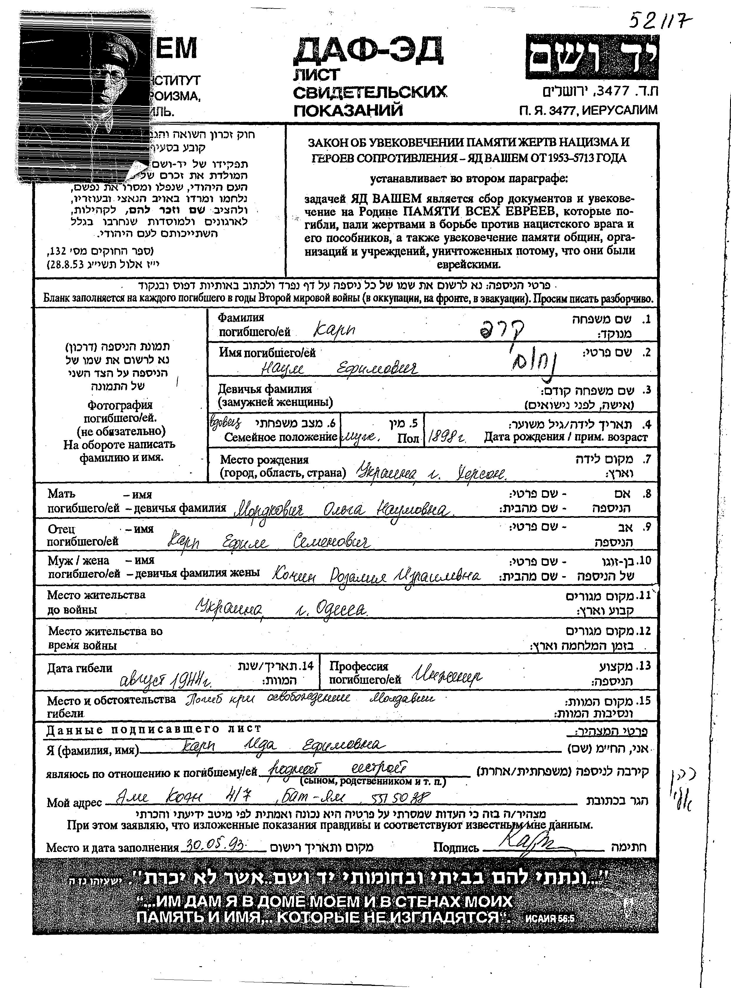 Nakhum Karp est né à Kherson, Ukraine (URSS) en 1898. Avant la seconde guerre mondiale il vivait à Odessa, Ukraine (URSS). Nakhum a été tué en tant que militaire pendant la Seconde Guerre mondiale. Lieu de la mort: Moldavia, Ukraine (URSS) en 1944.