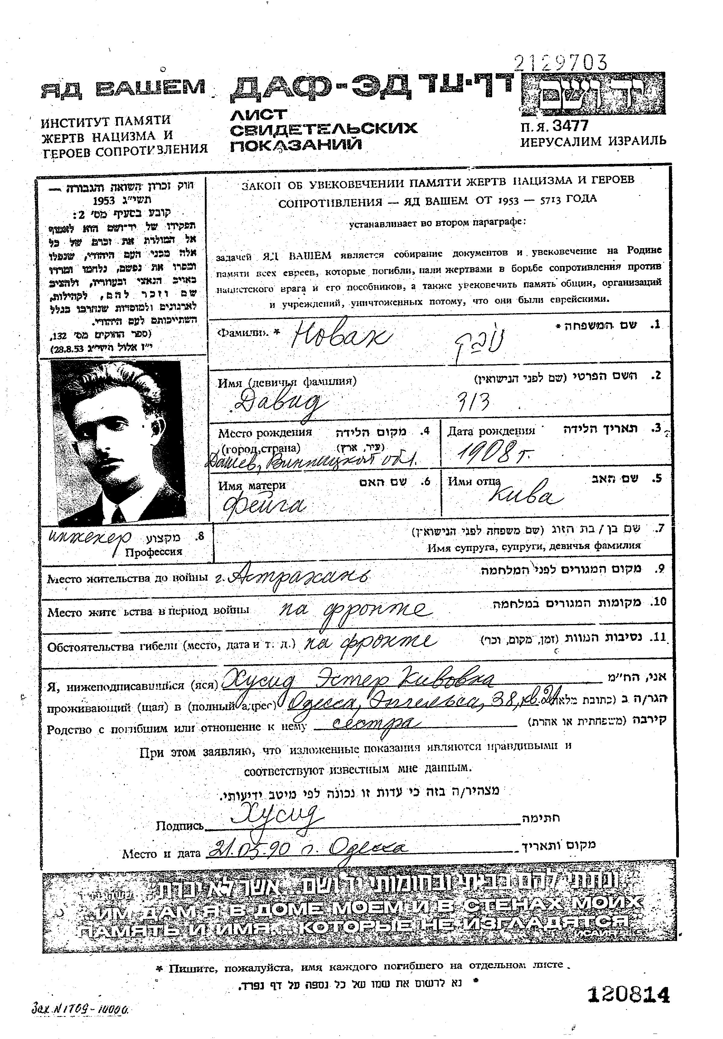 Novak David 1908 Astrakhan, Russie (URSS) Feuille de témoignage