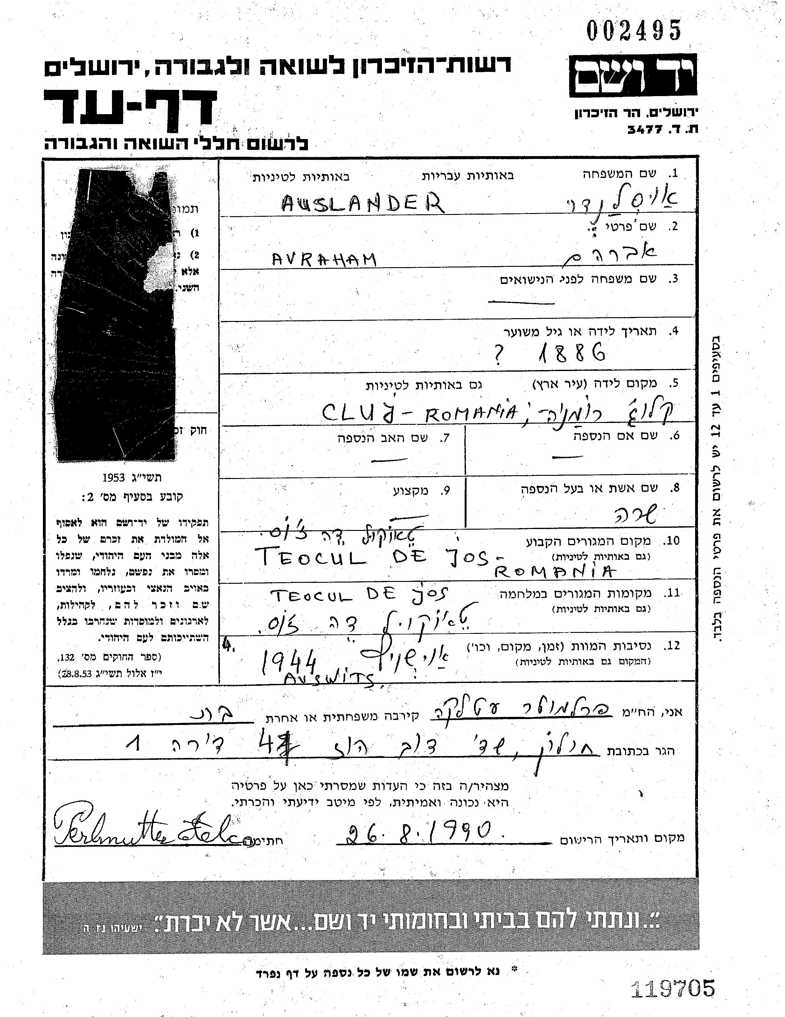 Avraham Auslander est né à Cluj, Roumanie en 1886. Avant la seconde guerre mondiale il vivait à Teocul de Jos, Roumanie.