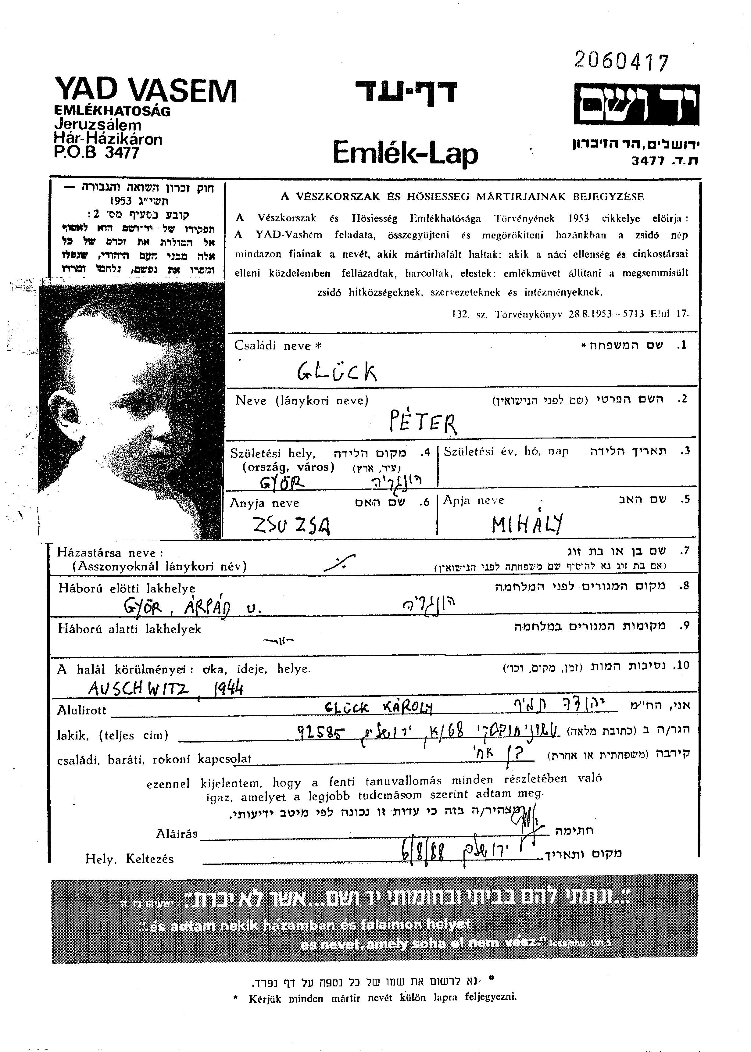 Glueck Peter Gyor, Hongrie Feuille de témoignage