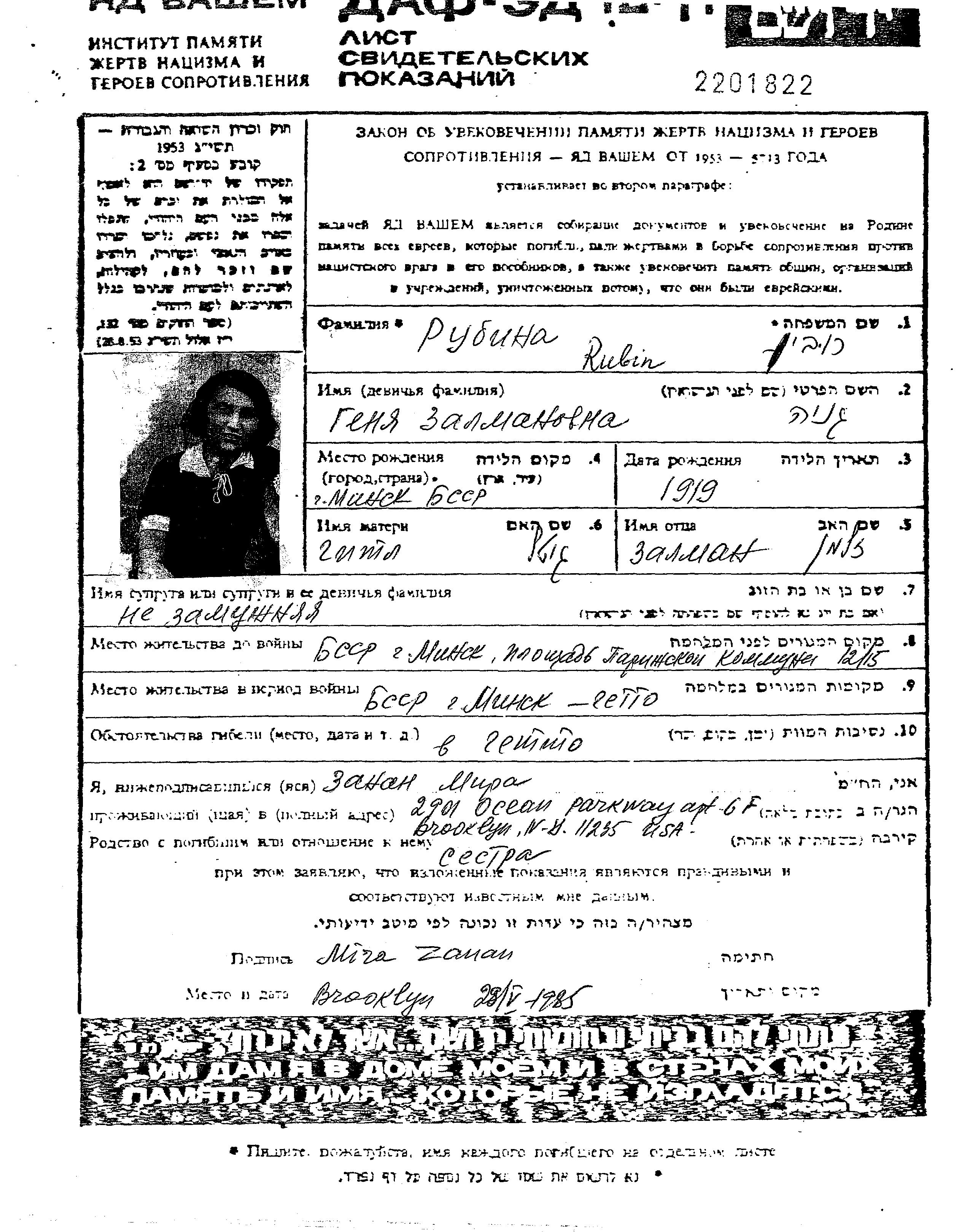 Rubin Genya 1919 Minsk, Bélorussie (URSS) Feuille de témoignage