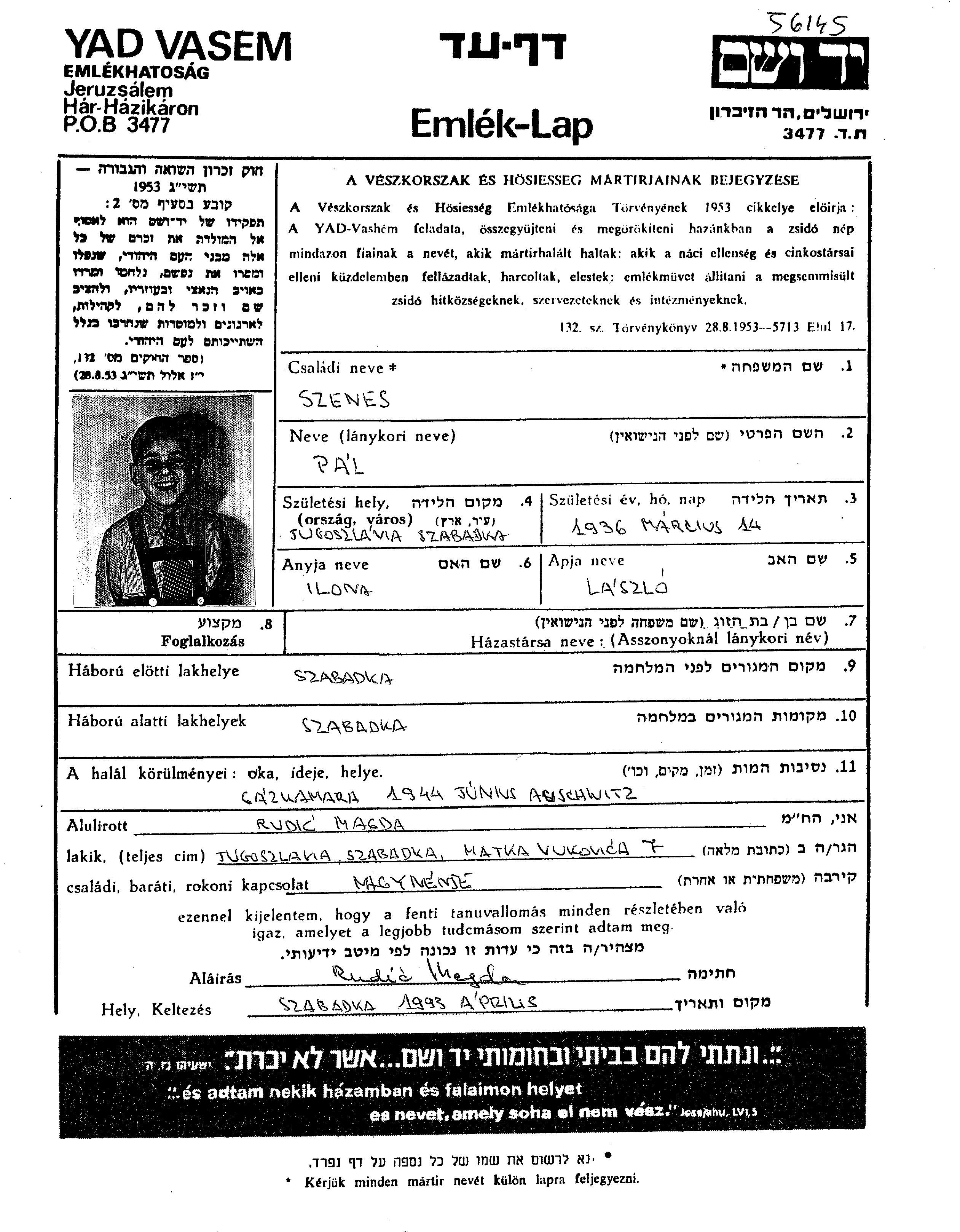 Szenes Pal 1936 Szabadka, Yugoslavie Feuille de témoignage