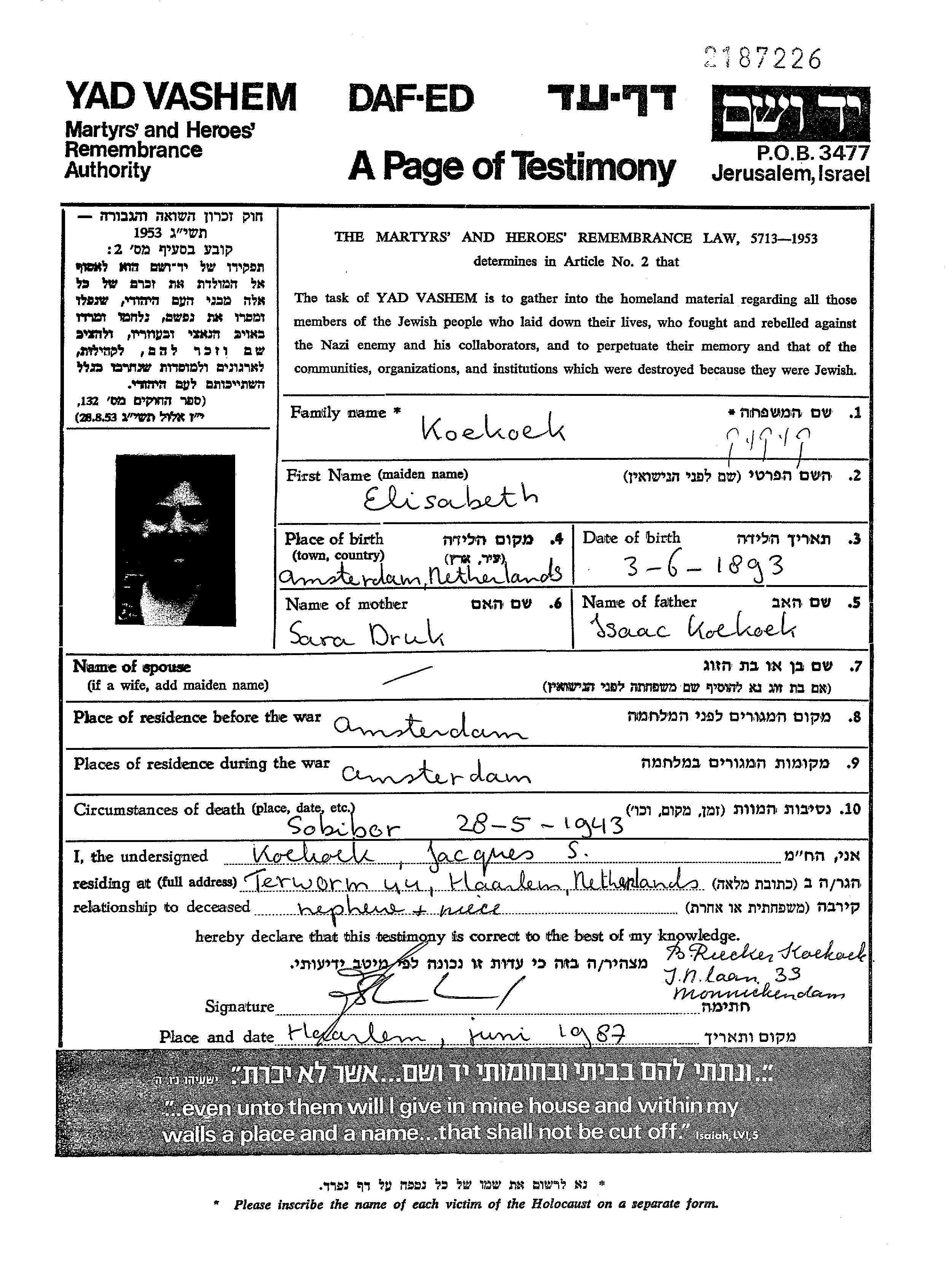 Koekoek Elisabeth 1893 Amsterdam, Pays-Bas Liste des Juifs des Pays-Bas assassinés