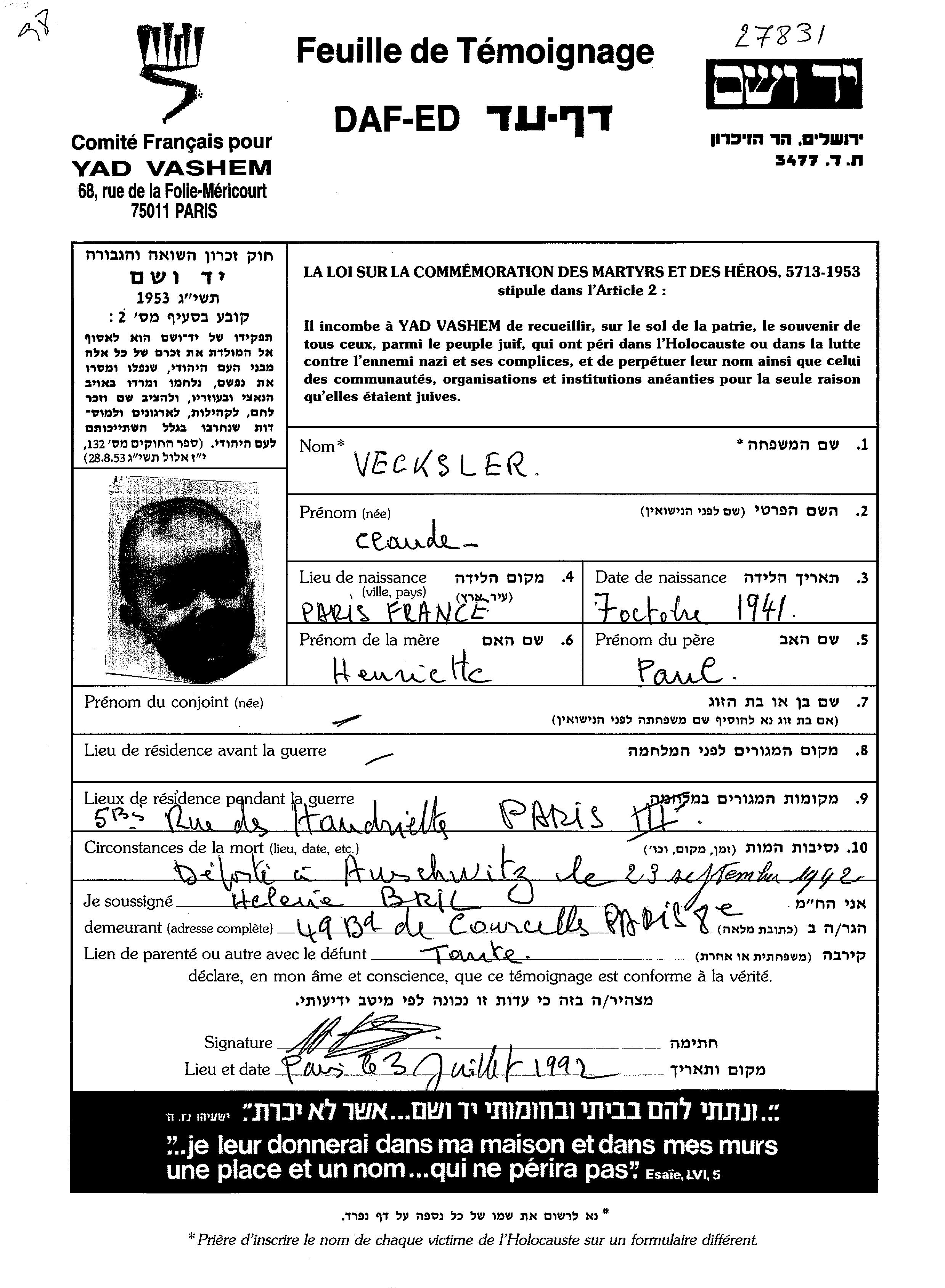 Vecksler Claude Klod 1941 Paris, France Feuille de témoignage
