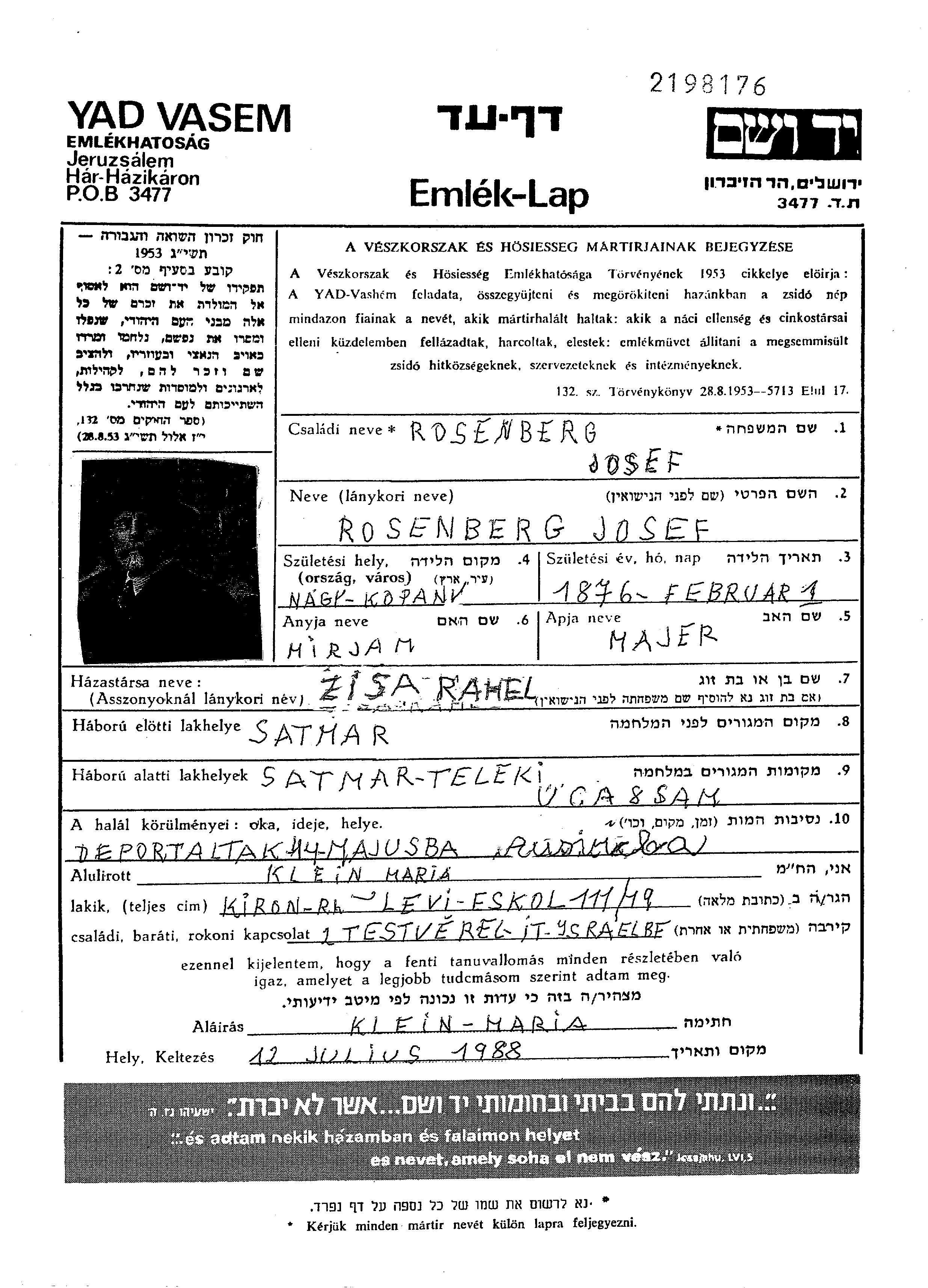 Rosenberg Josef 1876 Satmar, Roumanie Feuille de témoignage