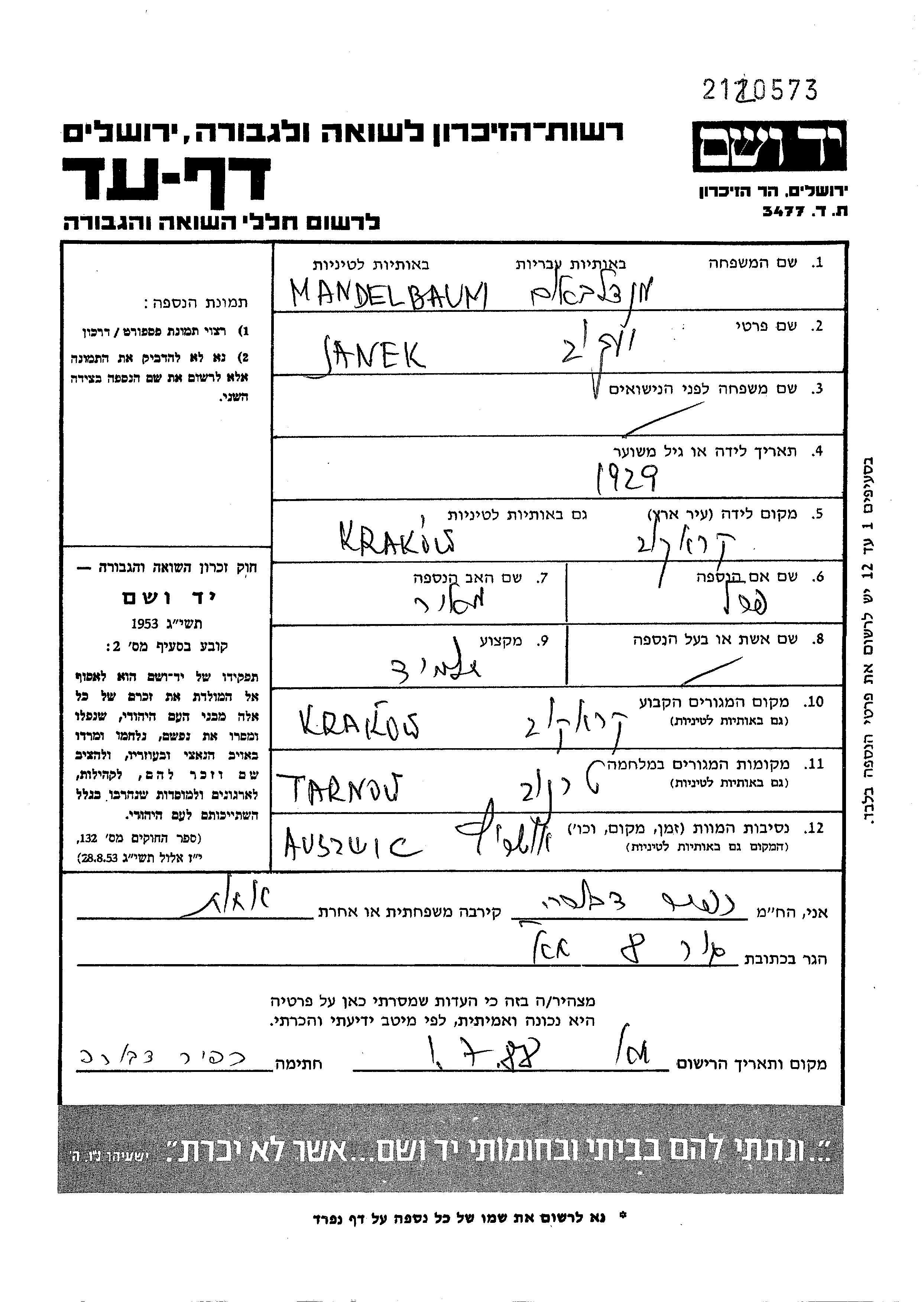 Janek Yakov Mandelbaum est né à Krakow, Pologne en 1929. Il était Élève. Avant la seconde guerre mondiale il vivait à Krakow, Pologne.