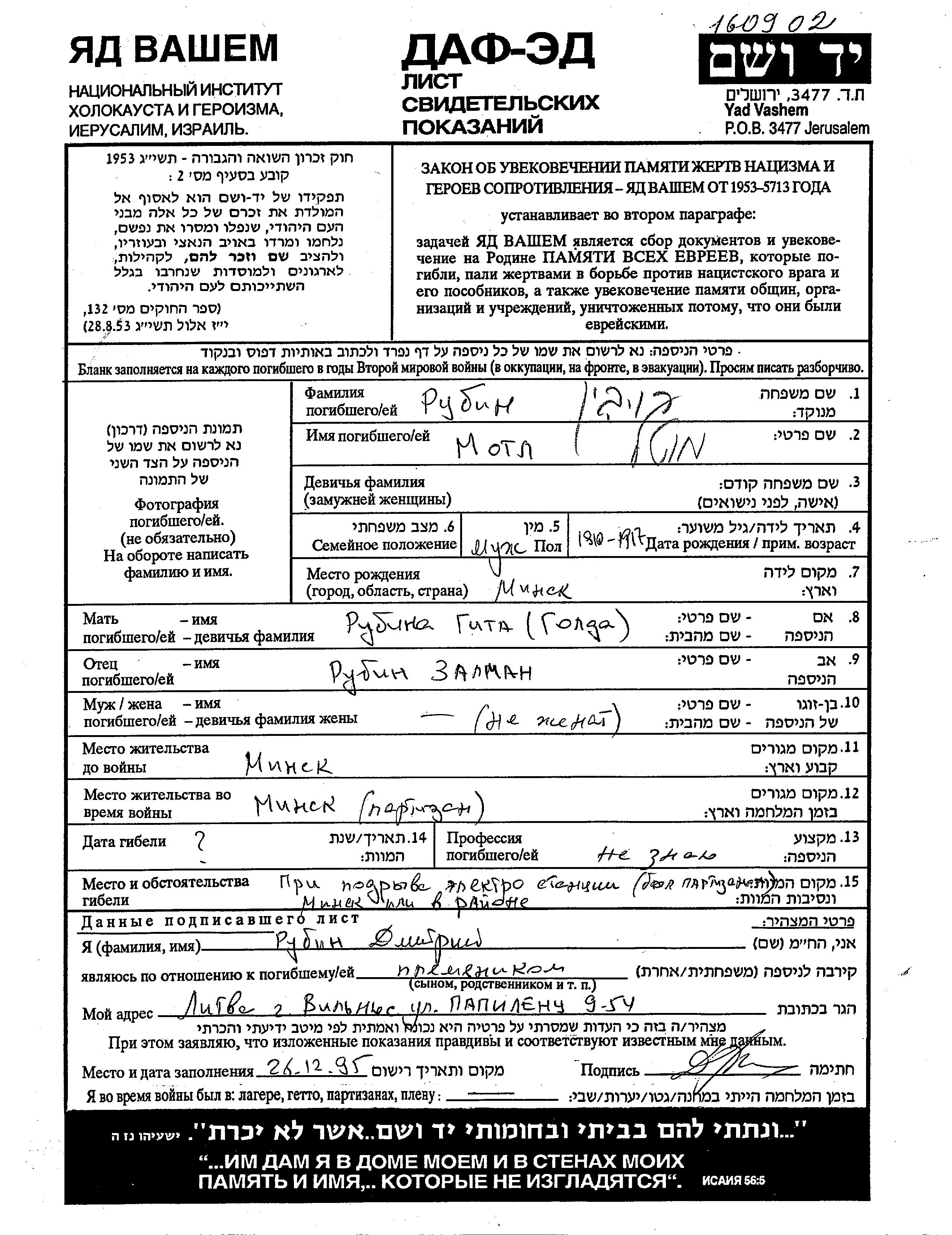 Motl Motel Rubin est né à Minsk, Bélorussie (URSS) en 1915. Avant la seconde guerre mondiale il vivait à Minsk, Bélorussie (URSS).