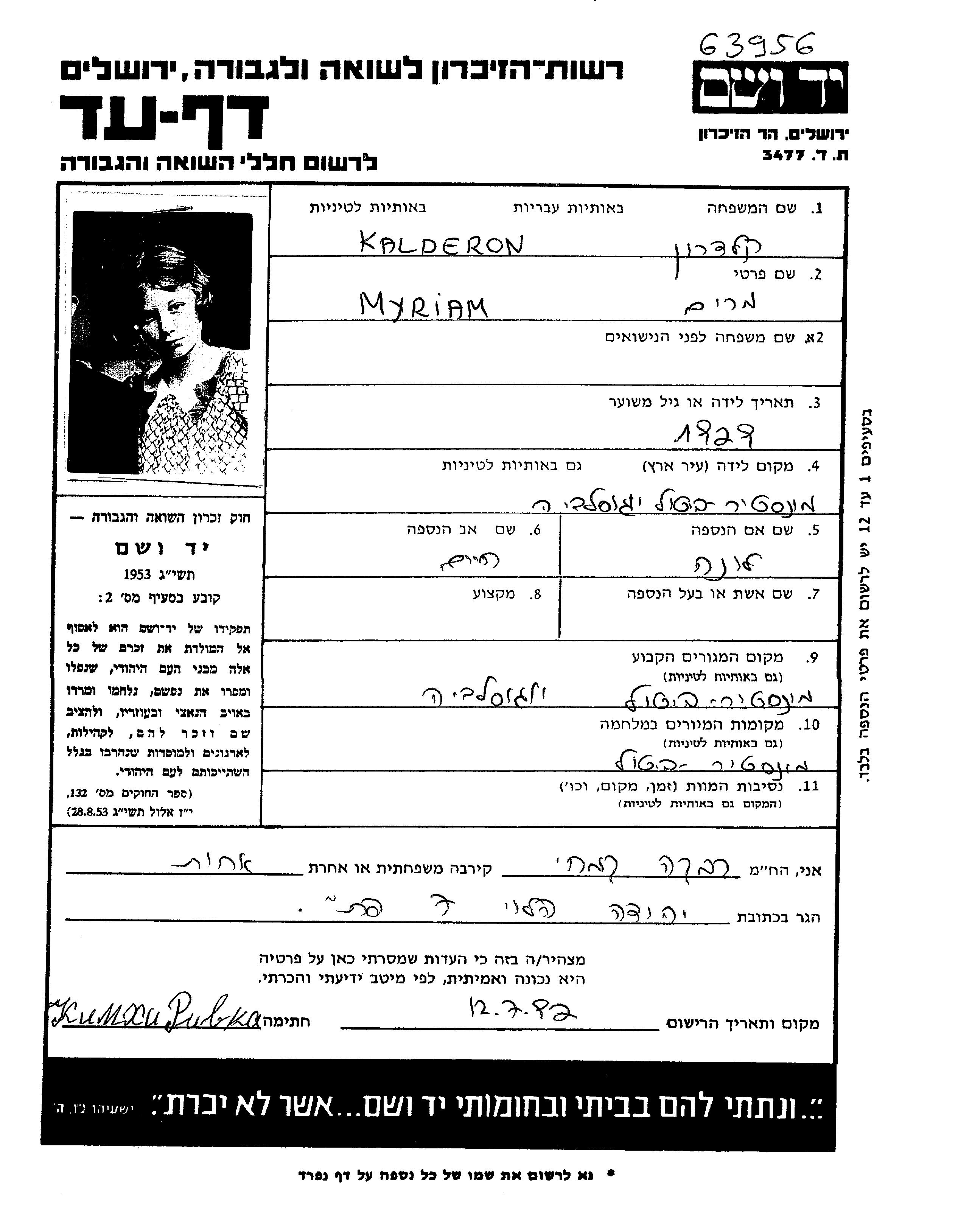 Kalderon Mirjam 1929 Monastir, Yugoslavie Feuille de témoignage