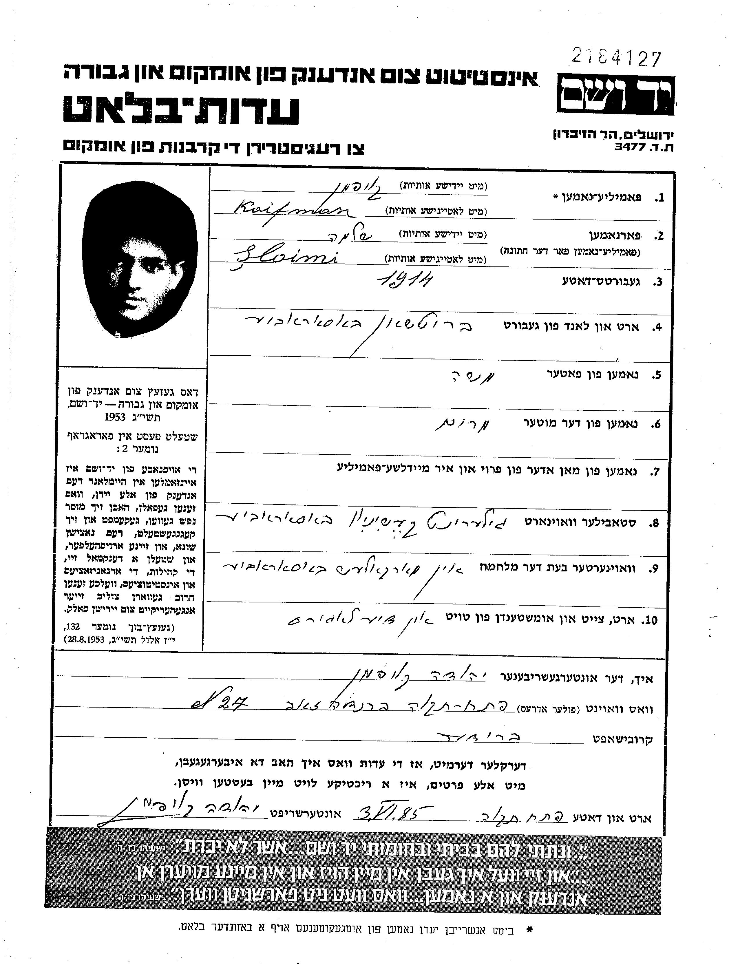 Sloimi a été assassiné pendant la Shoah. Lieu de la mort: endroit inconnu.