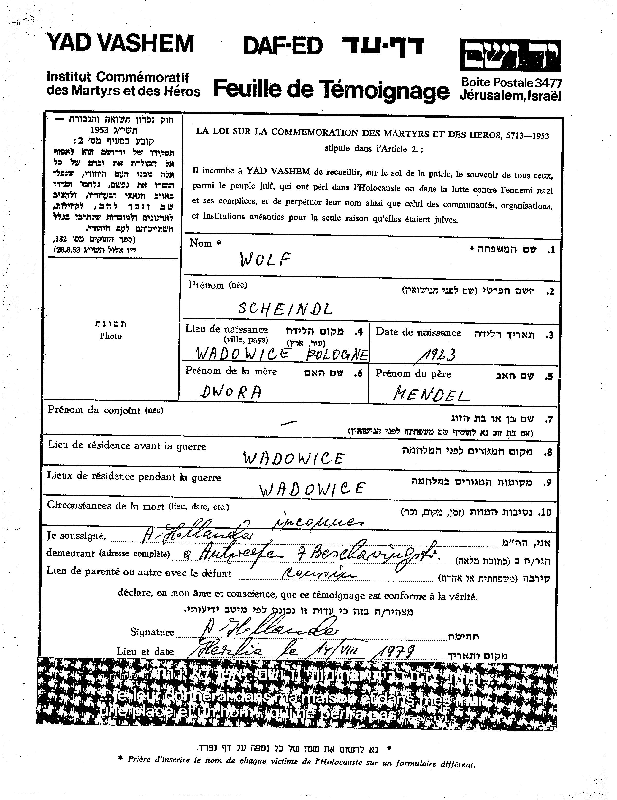 Wolf | Scheindl | 1923 | Wadowice, Pologne | Feuille de témoignage |