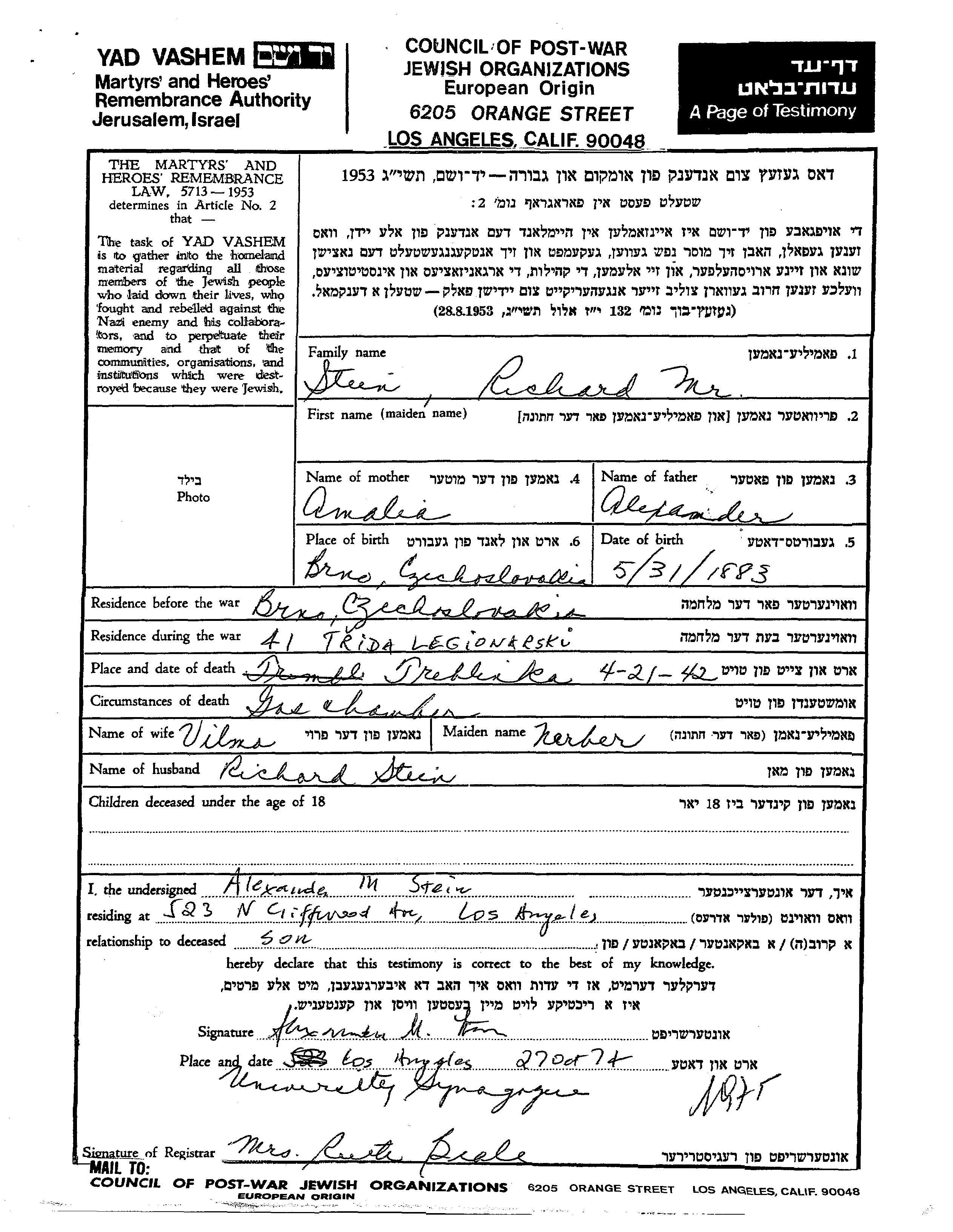 Stein | Richard | 1883 | Brno, Tchécoslovaquie | Feuille de témoignage |