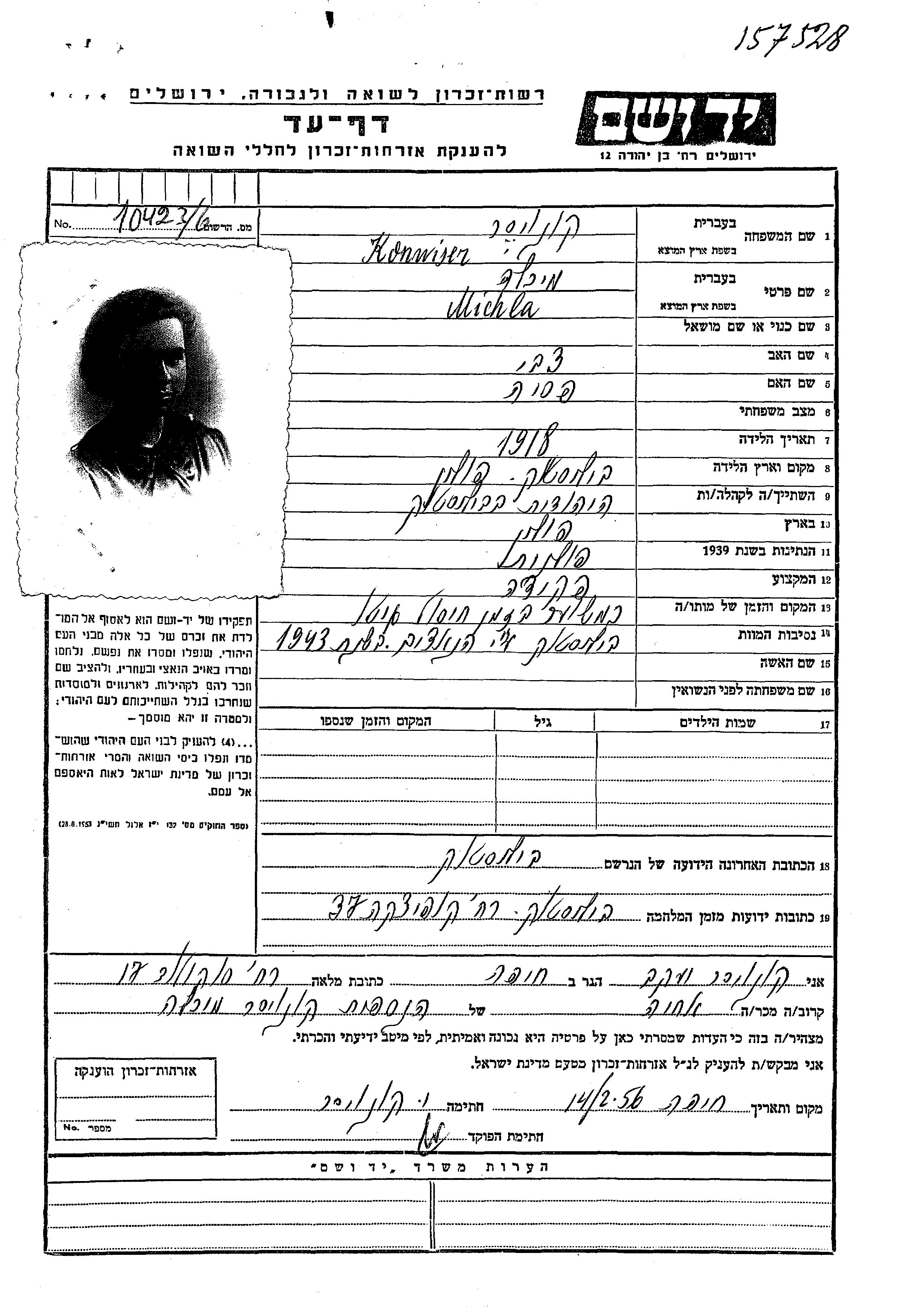 Michla Konwiser est née à Bialystok, Pologne en 1918. Elle était Employé/e de bureau. Avant la seconde guerre mondiale elle vivait à Bialystok, Pologne.