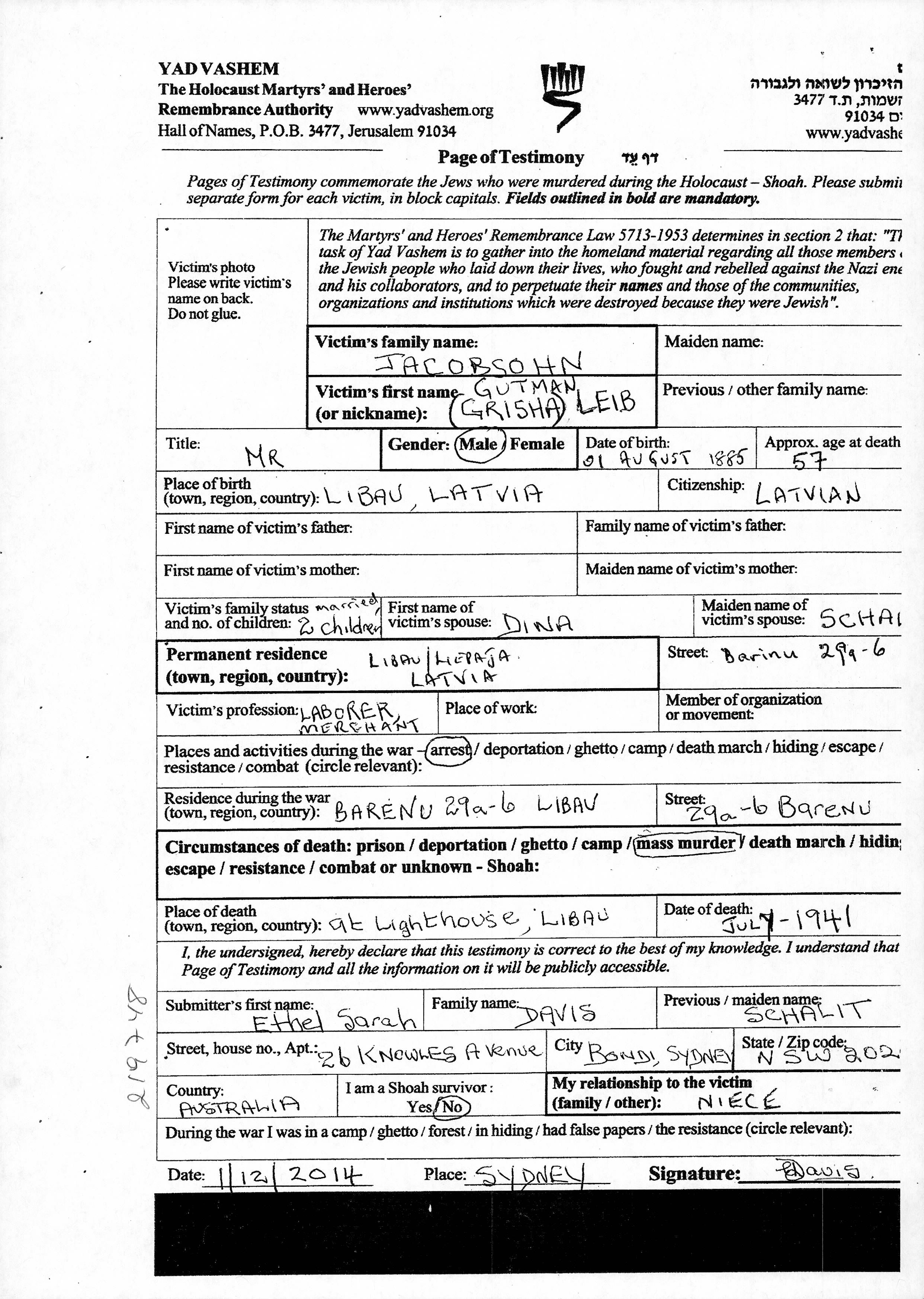 Jacobson Grisha Libau, Lettonie Feuille de témoignage