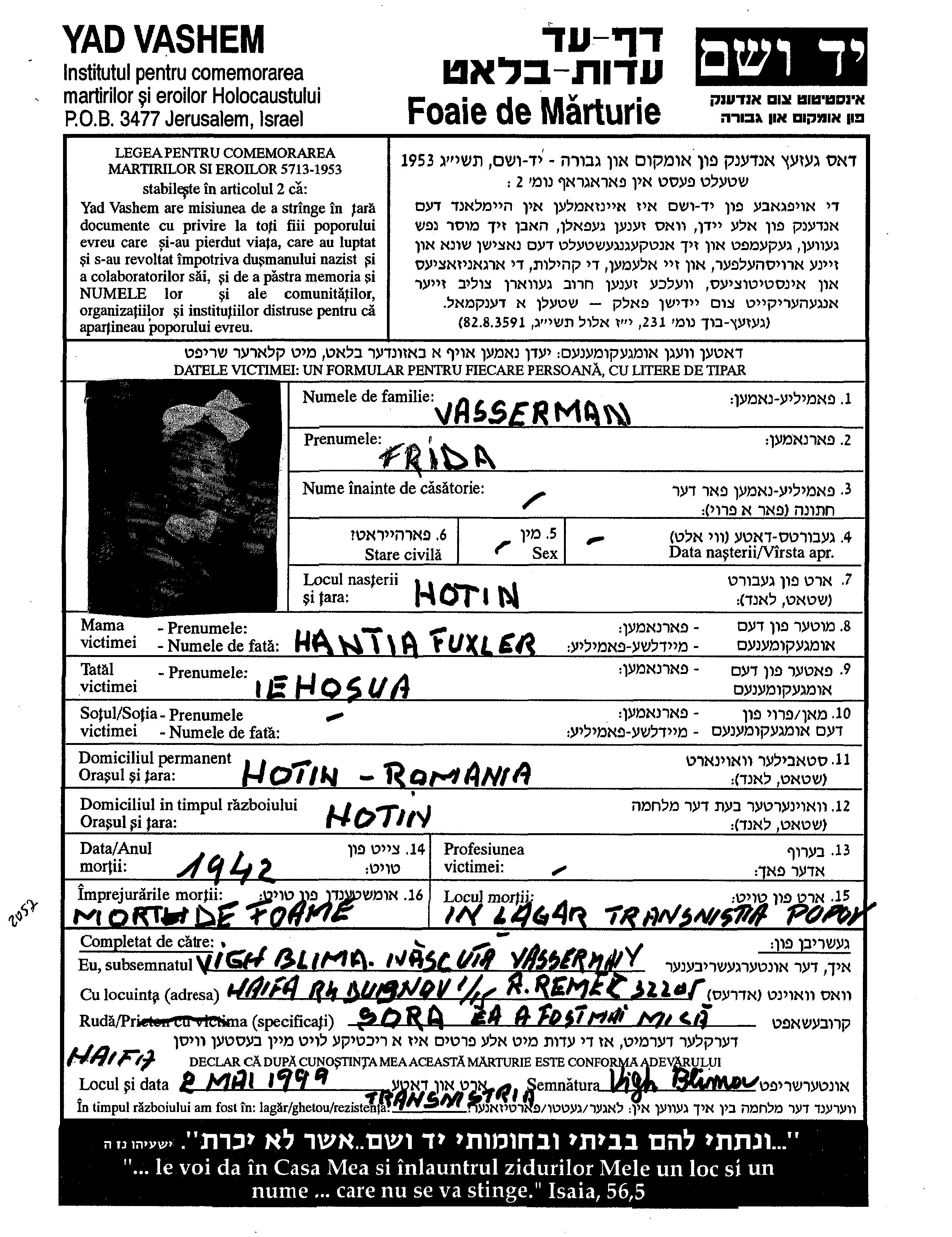 | Vaserman | Frida | Hotin, Roumanie | Feuille de témoignage | |