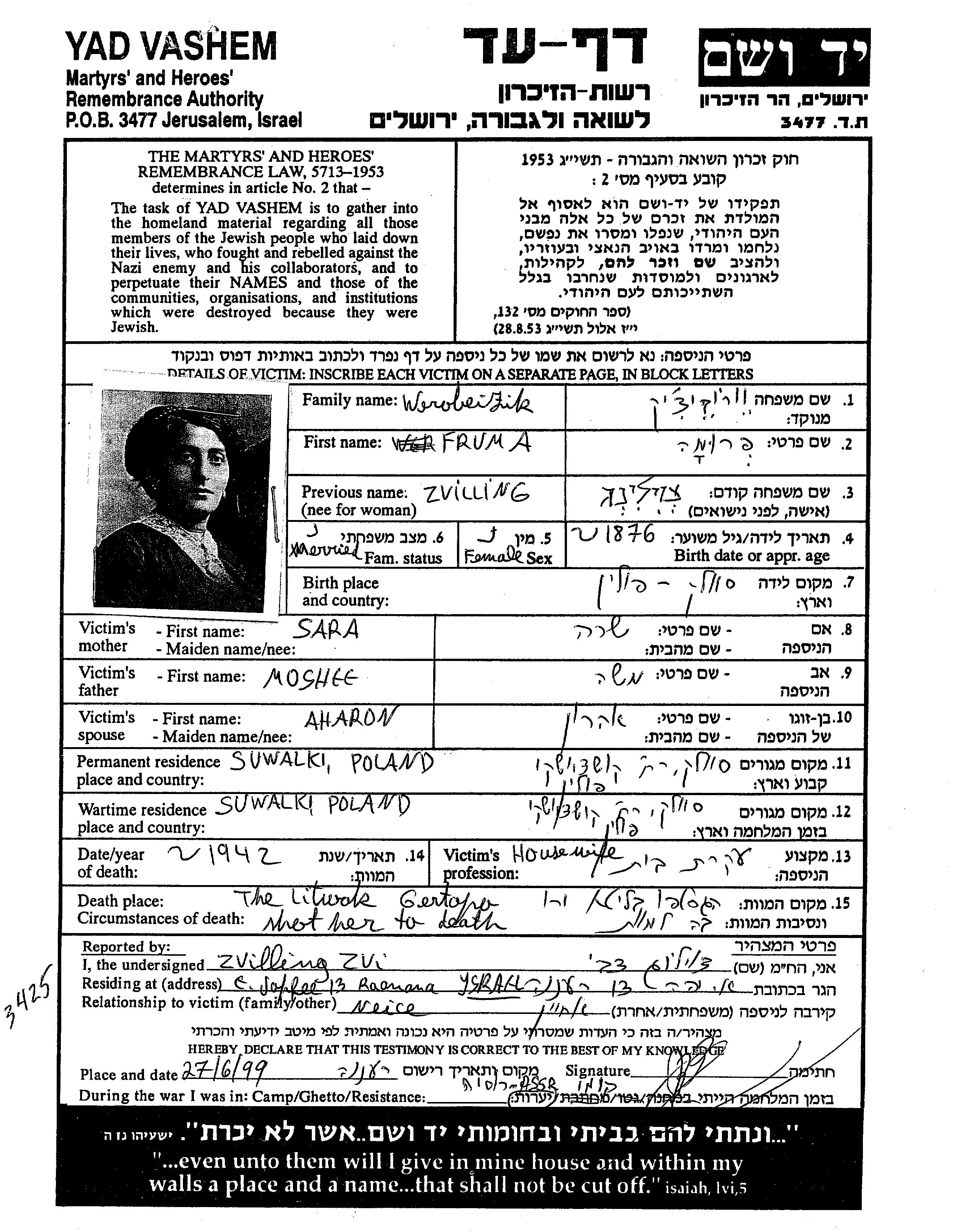 Werobeizik Fruma 1876 Suwalki, Pologne Feuille de témoignage
