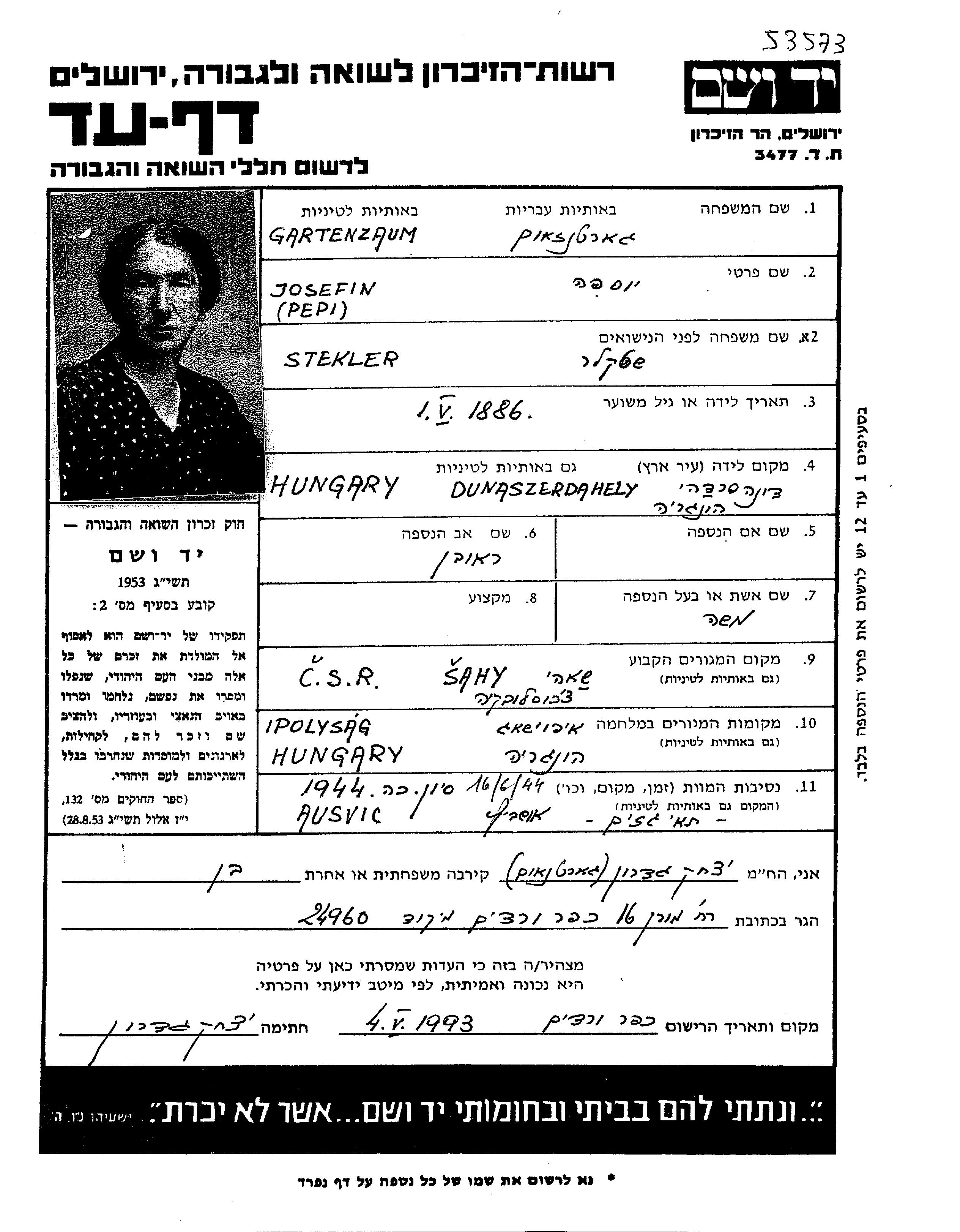 Josefin Pepi Gartenzaum née Stekler est née à Dunajska Streda, Tchécoslovaquie en 1886. Avant la seconde guerre mondiale elle vivait à Sahy, Tchécoslovaquie.
