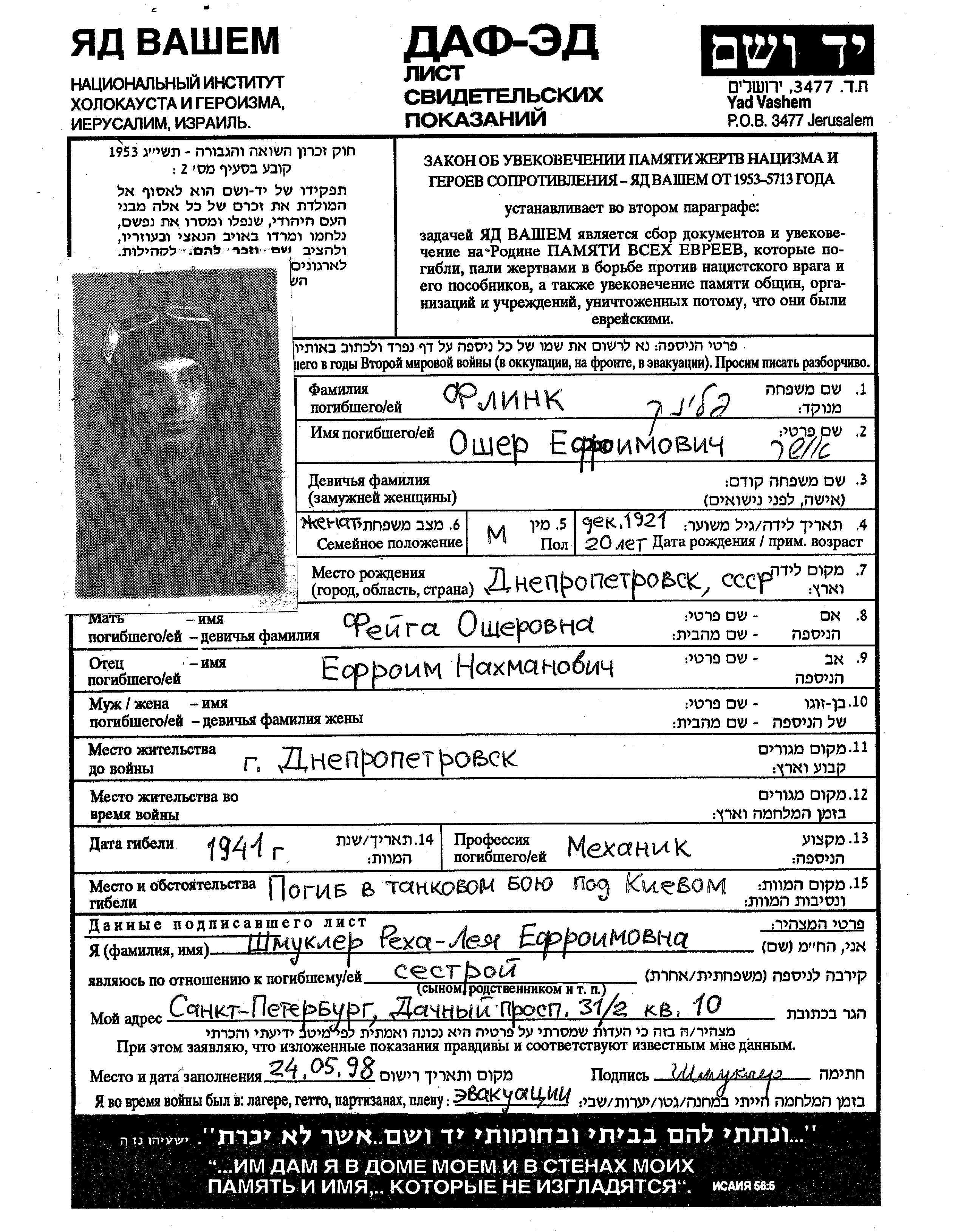 Flink Osher 1921 Dnepropetrovsk, Ukraine (URSS) Feuille de témoignage