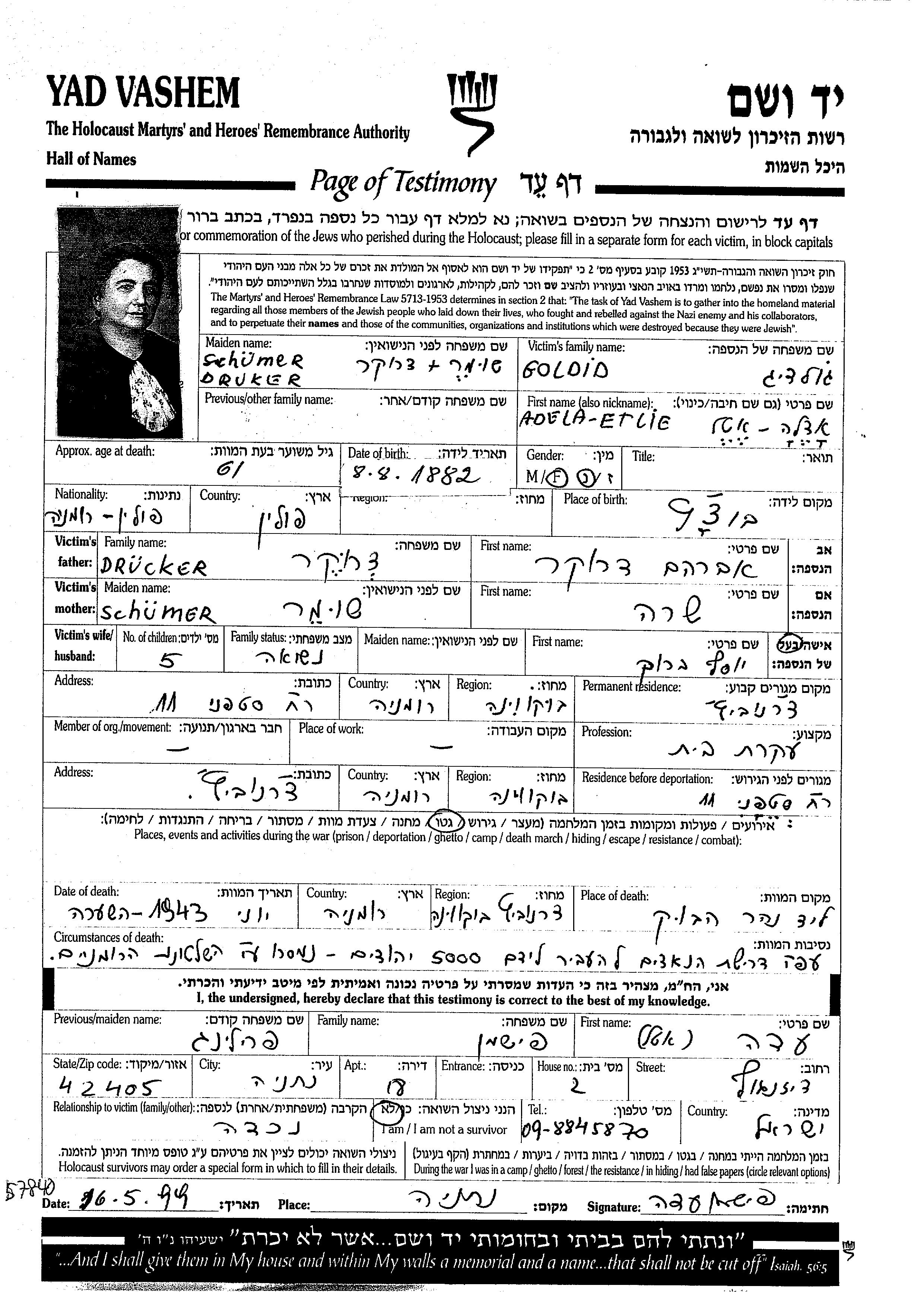 Schumer Goldig | Etlie Adela | 1882 | Czernowitz, Roumanie | Feuille de témoignage |