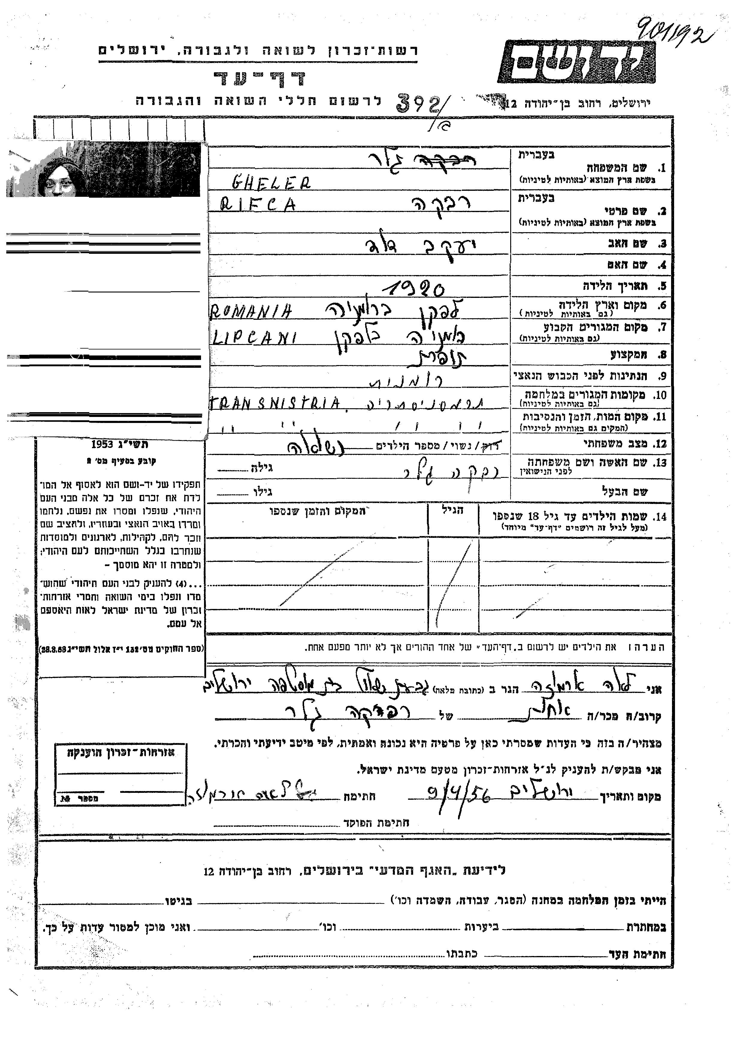 Gheler Rifca 1920 Lipcani, Roumanie Feuille de témoignage