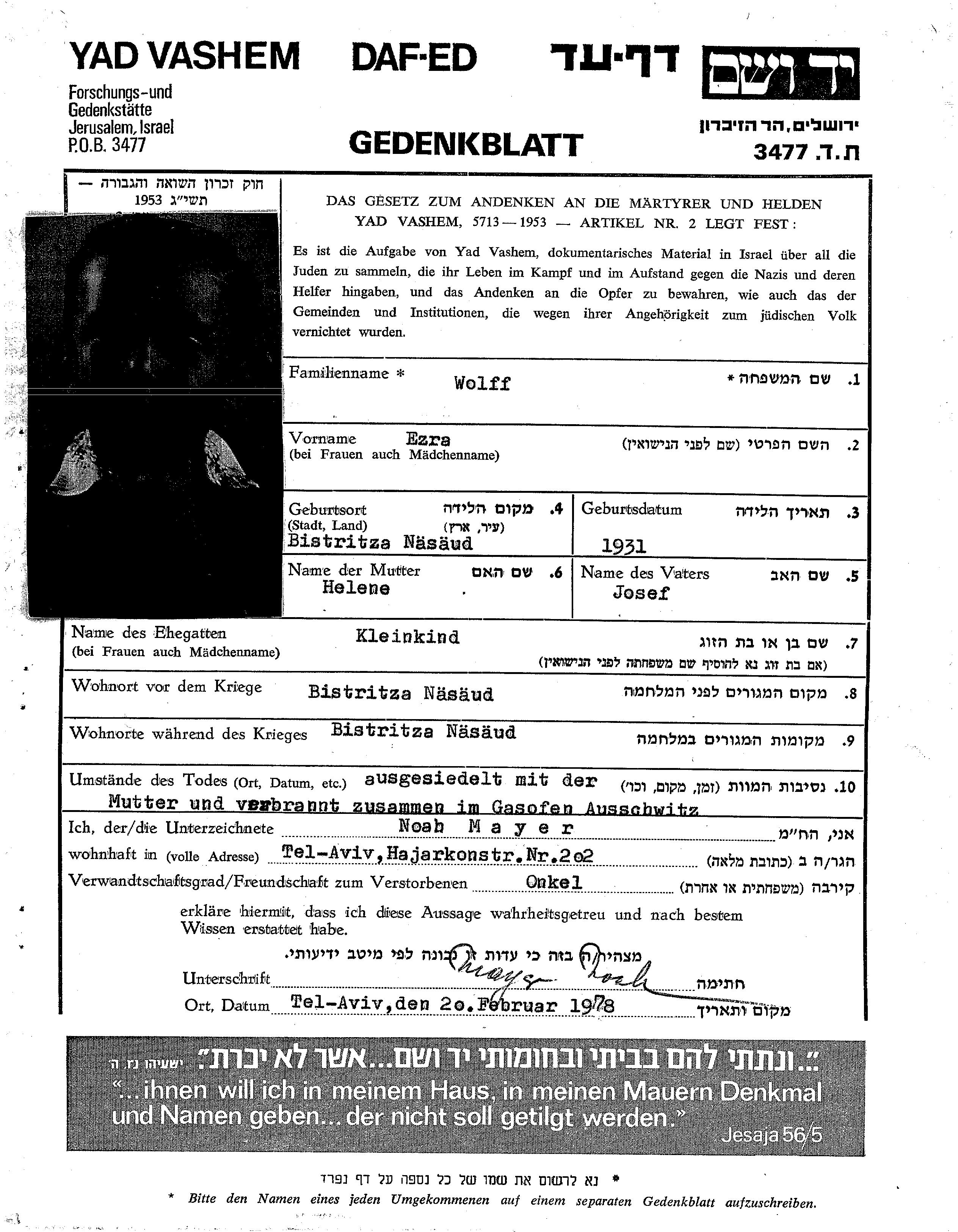 Ezra Wolff est né à Bistrita, Roumanie en 1931. Avant la seconde guerre mondiale il vivait à Bistrita, Roumanie.